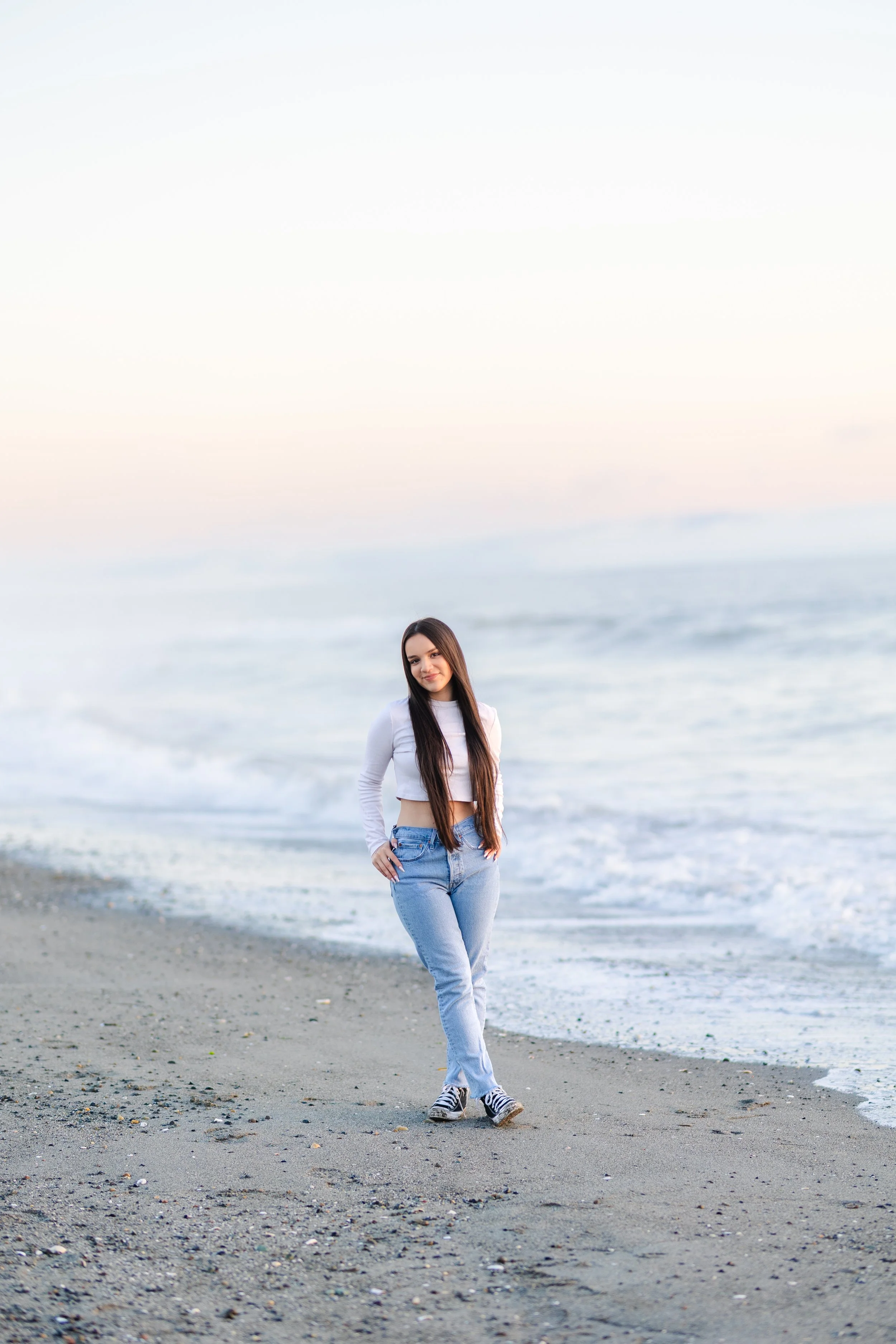 Emri’s golden sunrise senior session at Point No Point beach in North Kitsap was so dreamy! She chose her outfit wisely, going with a long sleeve top and jeans so she would still look cute, but not freeze to death. Her white top was bright and flattering against the orange and yellow tones from the sun.