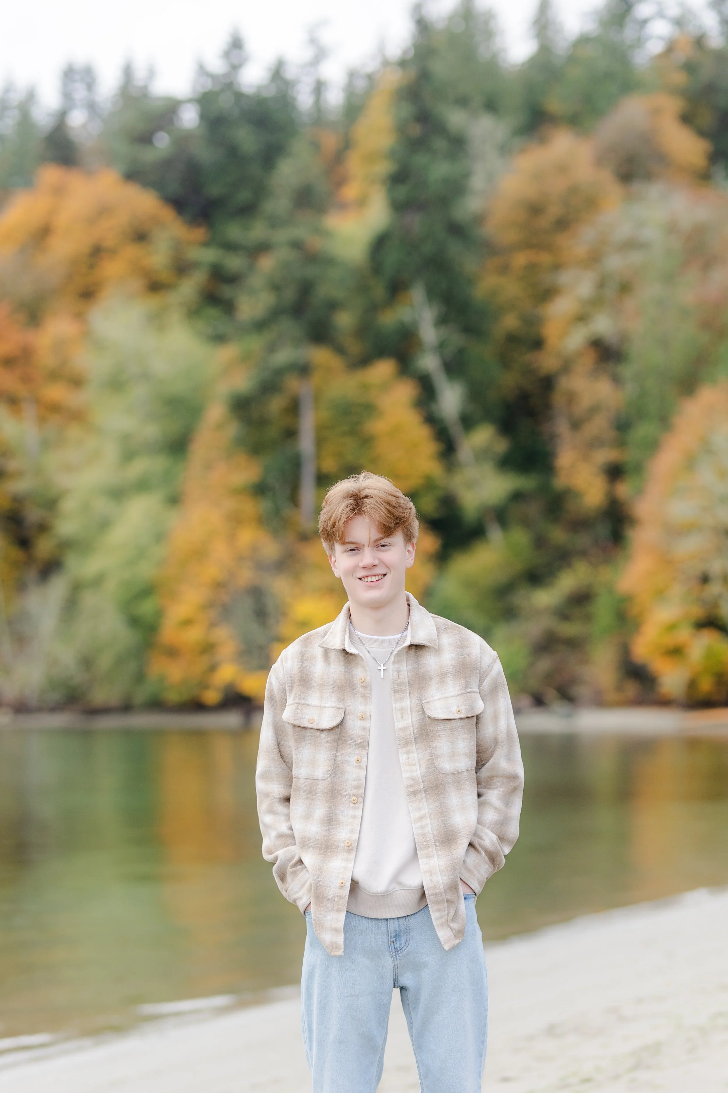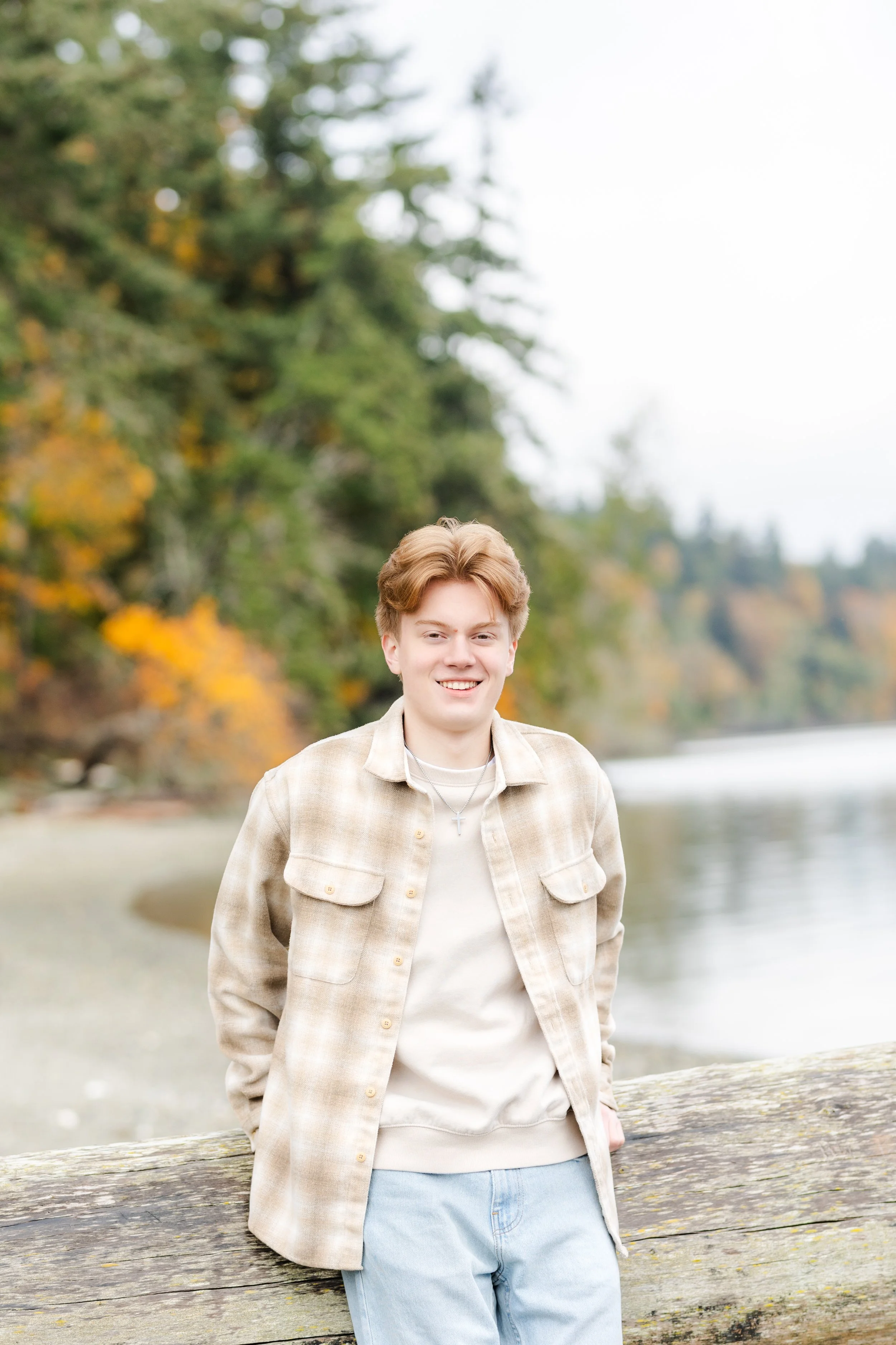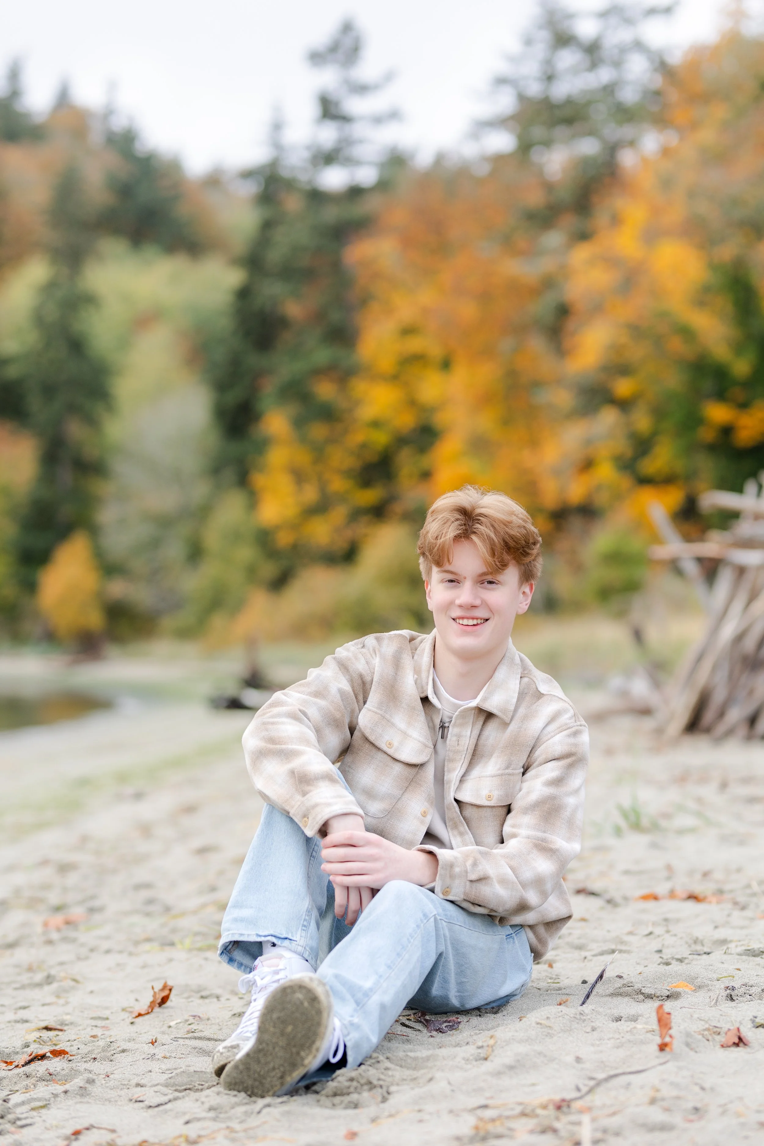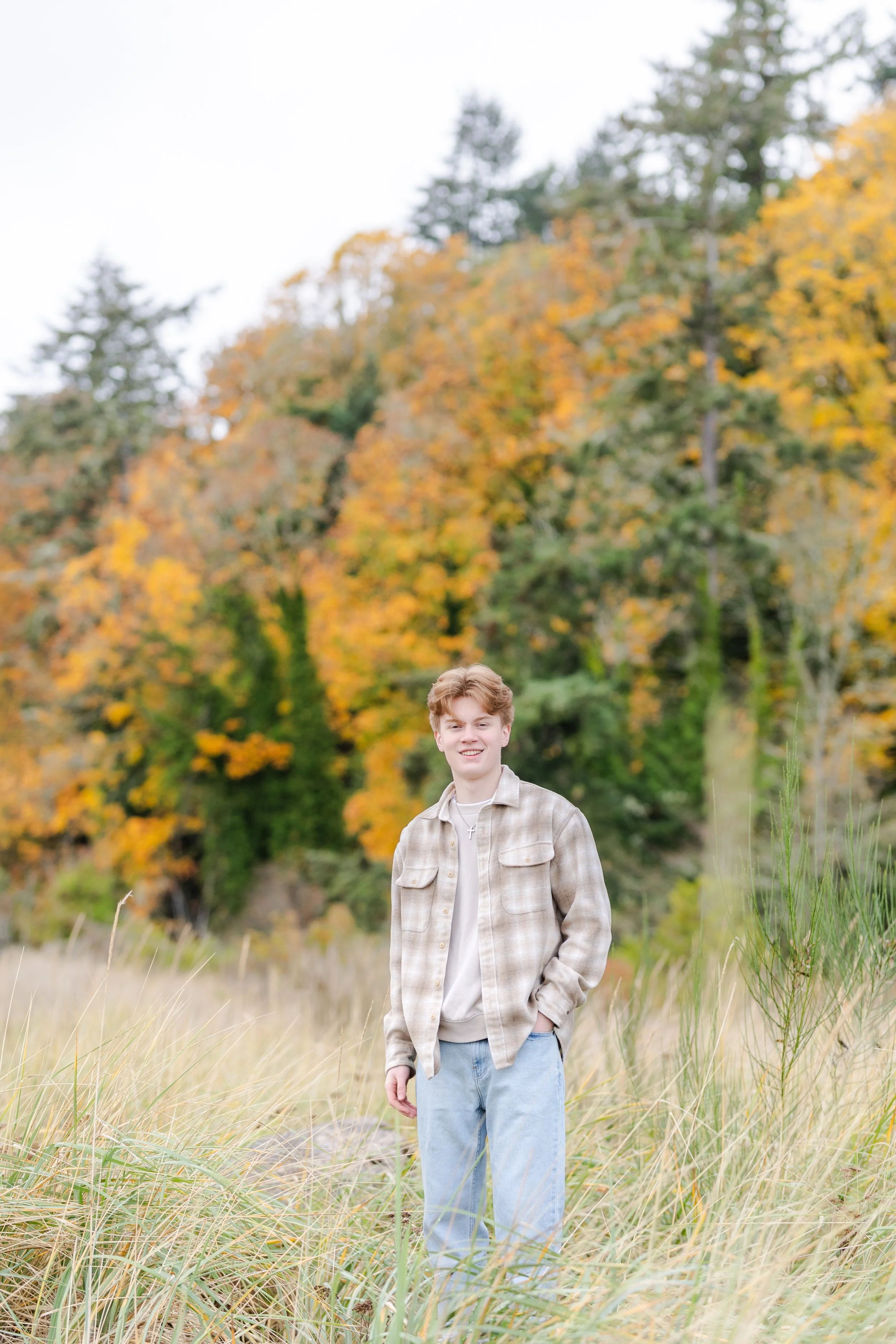 Justin wanted a combo of beach and fall colors for his senior portraits, so he chose to have them taken at Anderson Point Park in Ollala. He wore a lighter, neutral-toned outfit that matched both the beach and fall vibes for his session.
