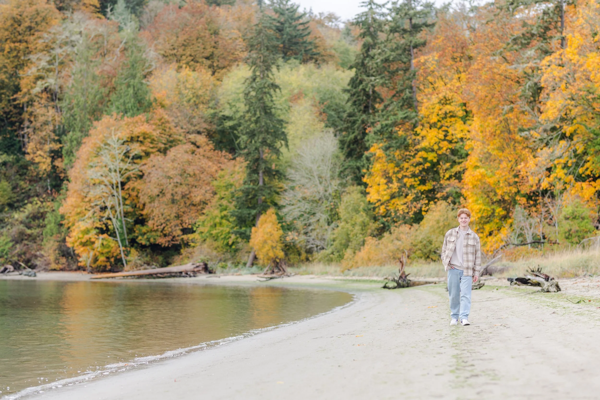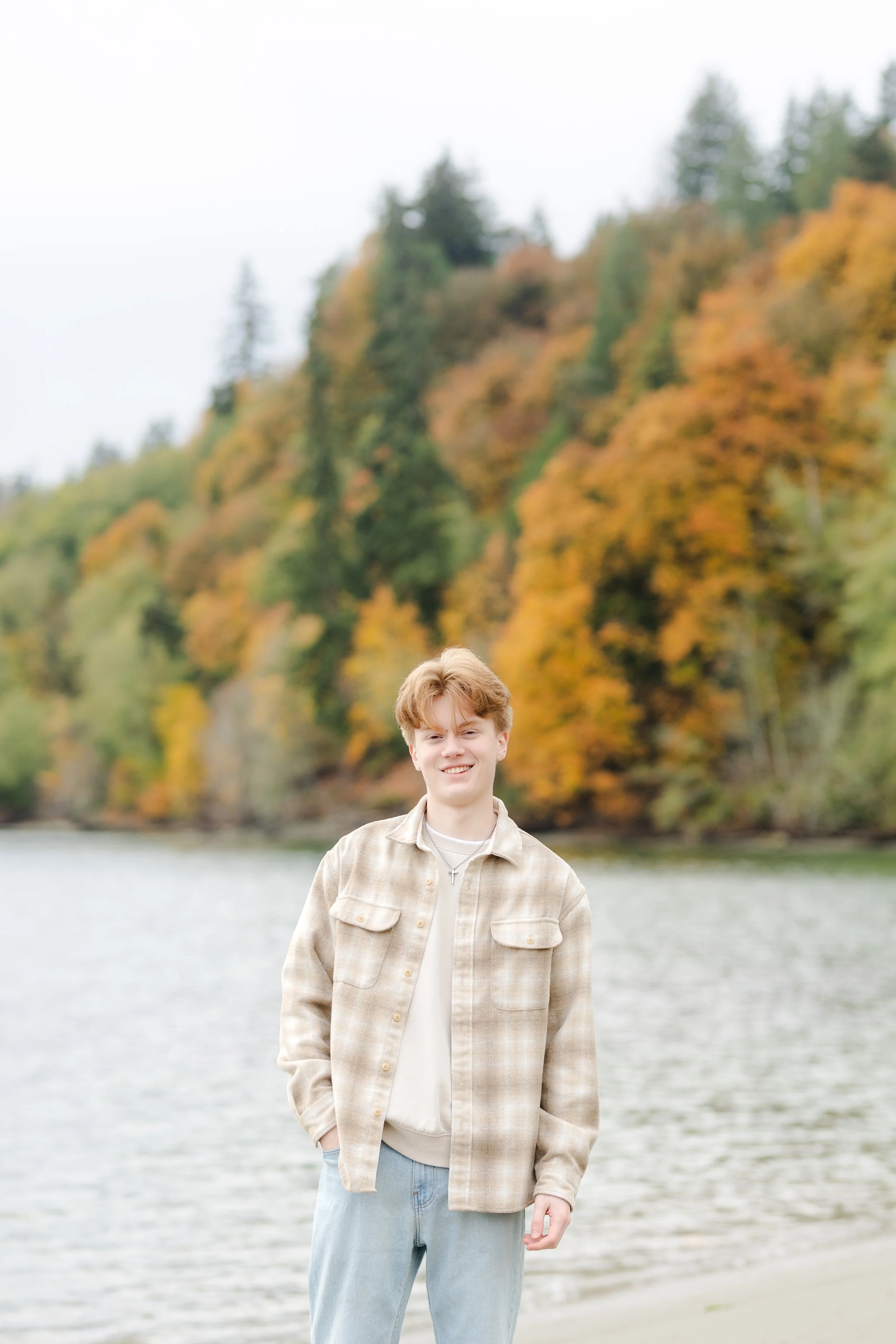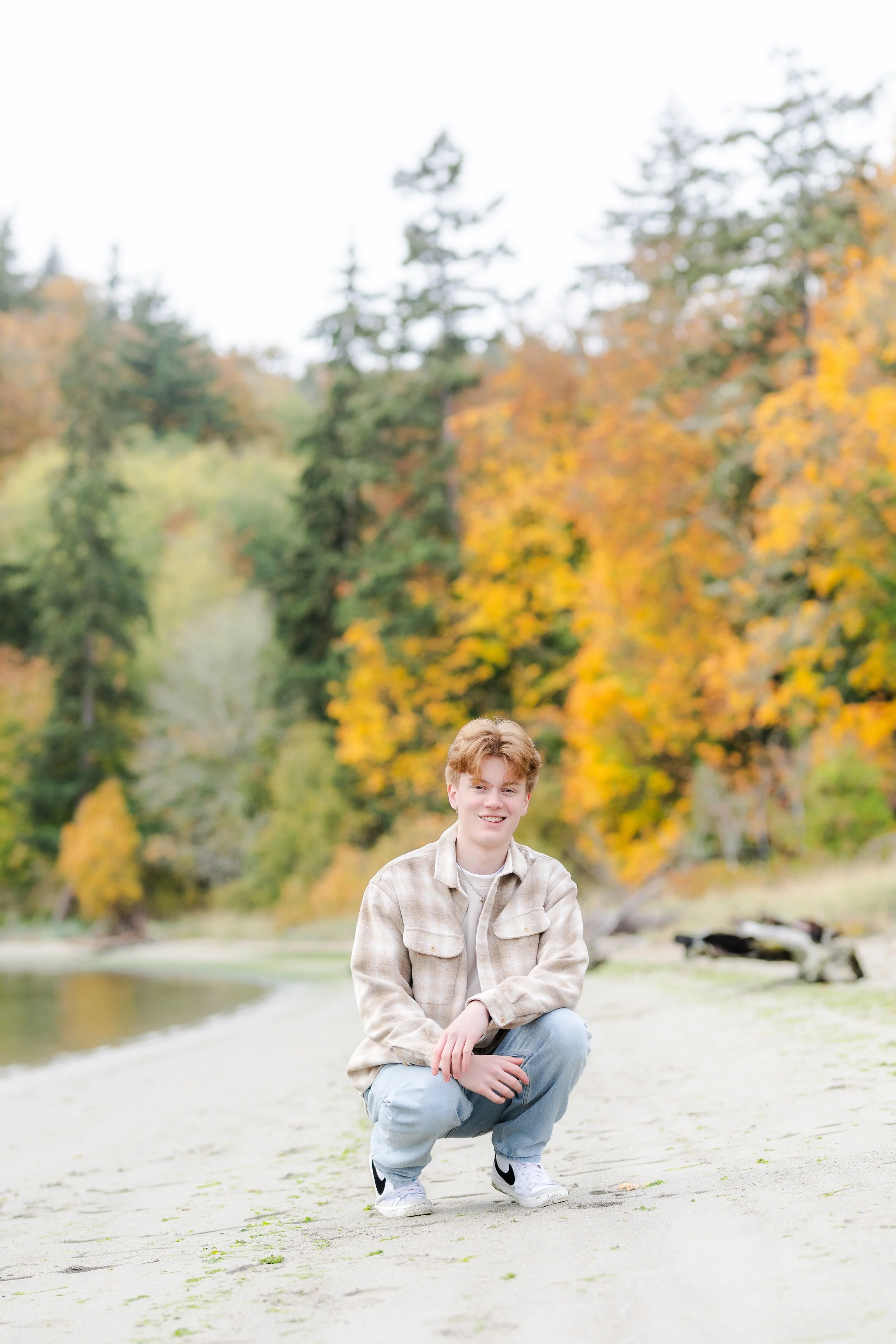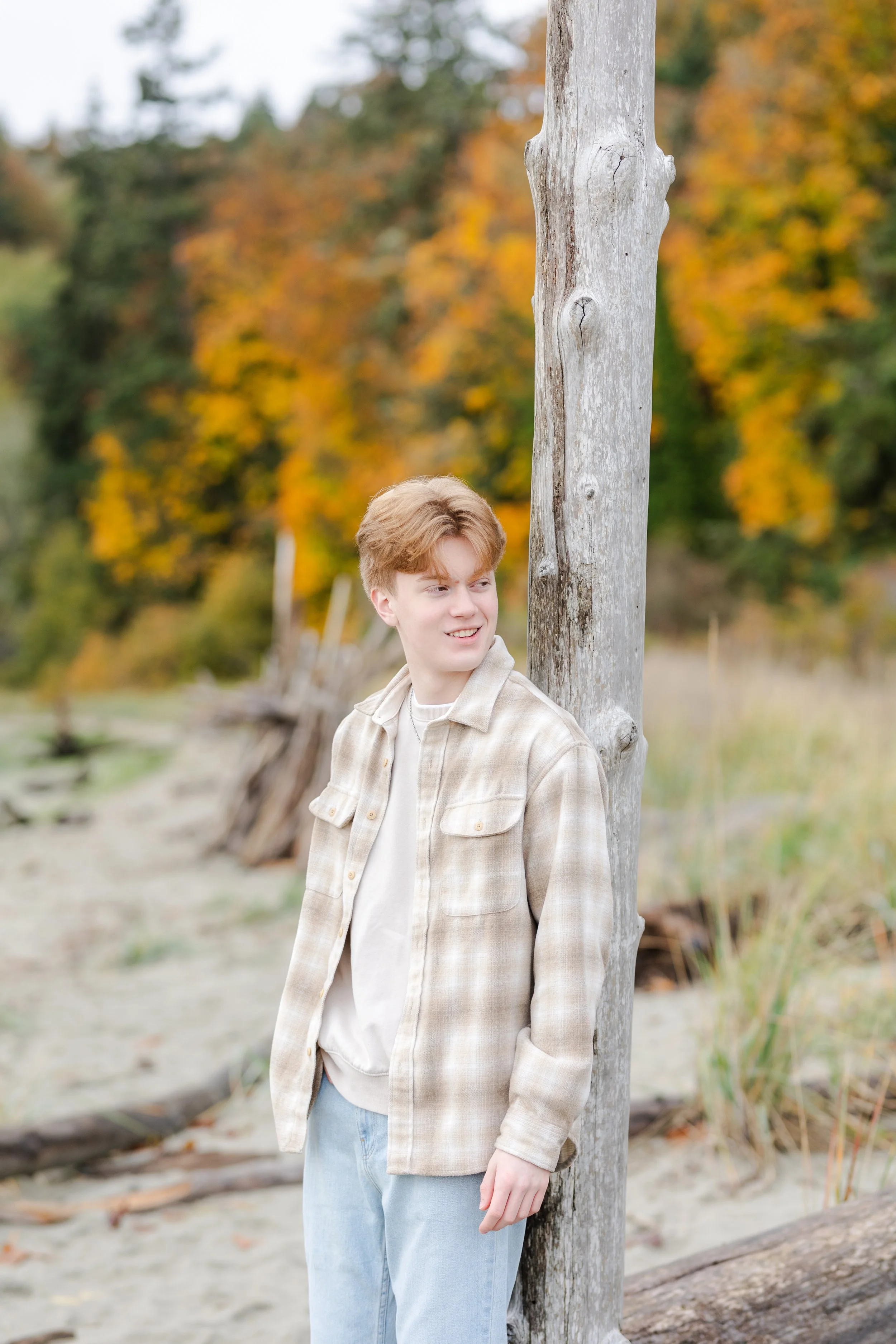 Justin wanted a combo of beach and fall colors for his senior portraits, so he chose to have them taken at Anderson Point Park in Ollala. He wore a lighter, neutral-toned outfit that matched both the beach and fall vibes for his session.