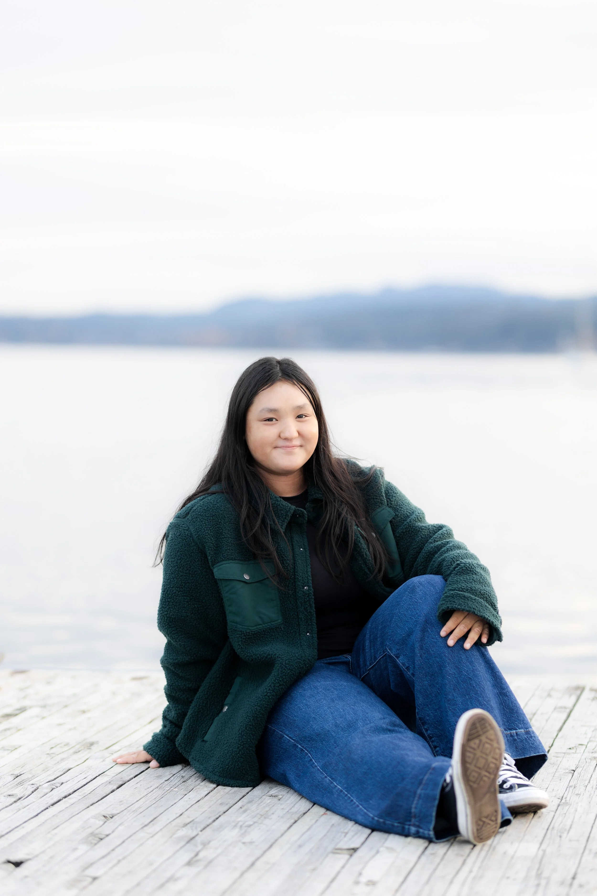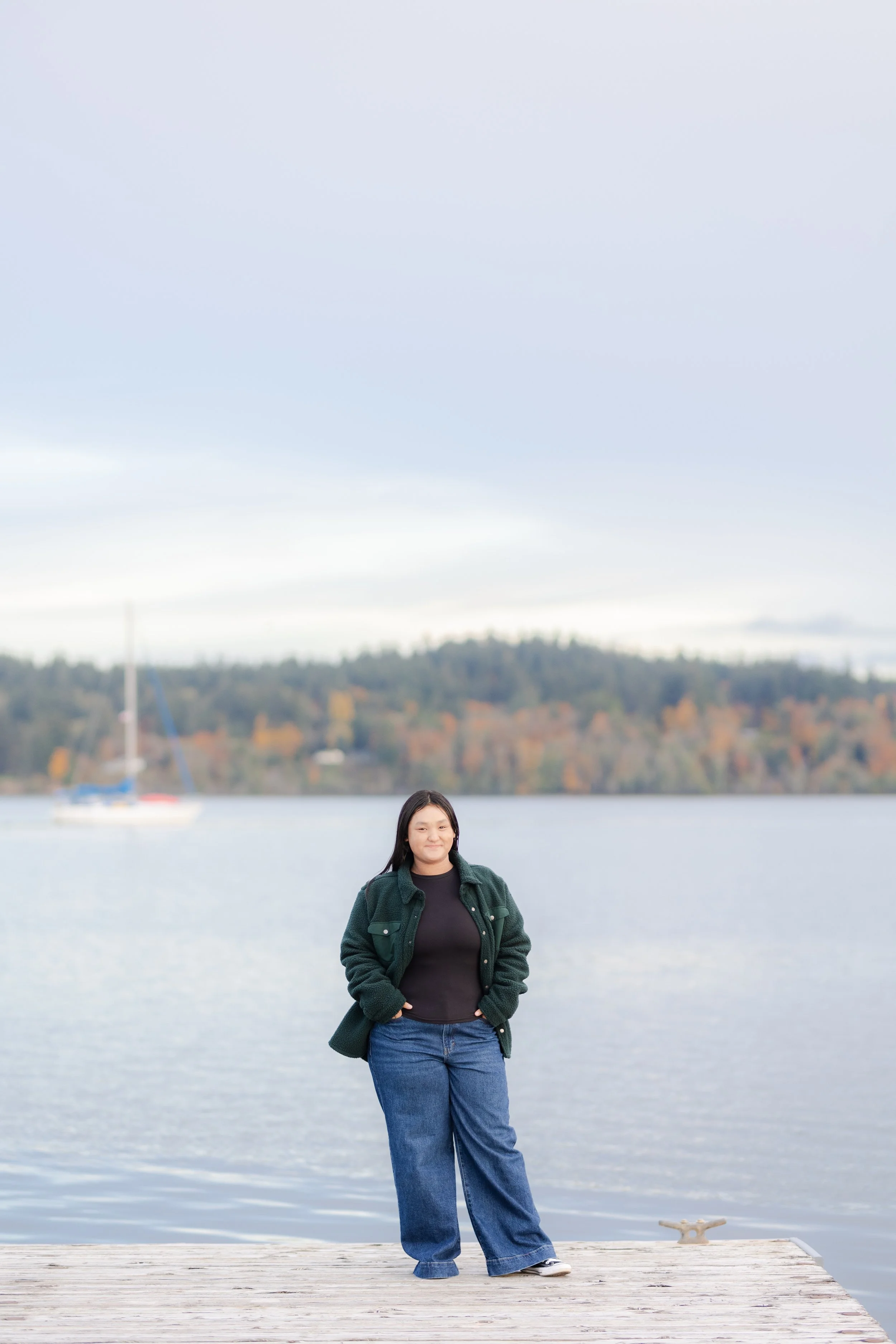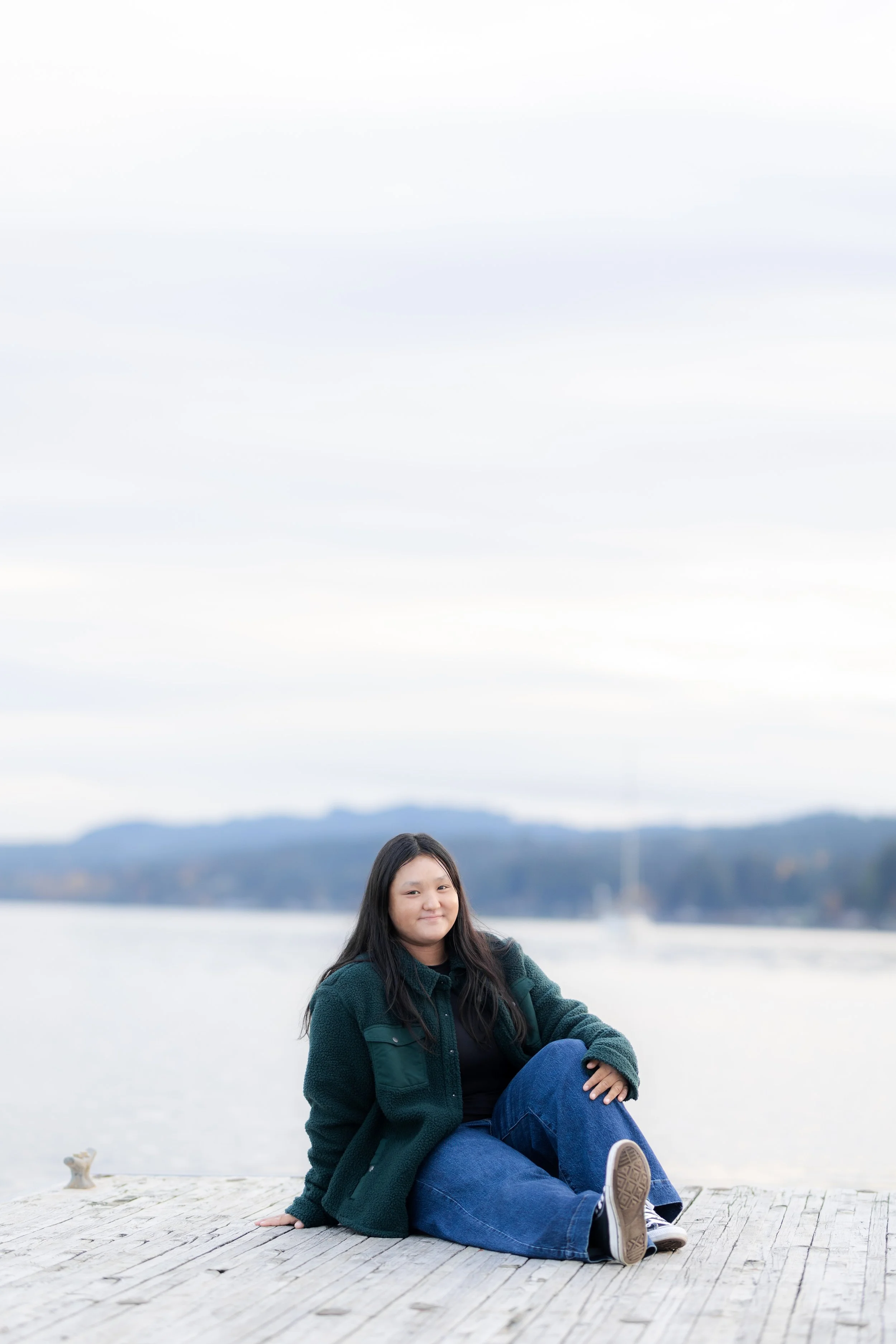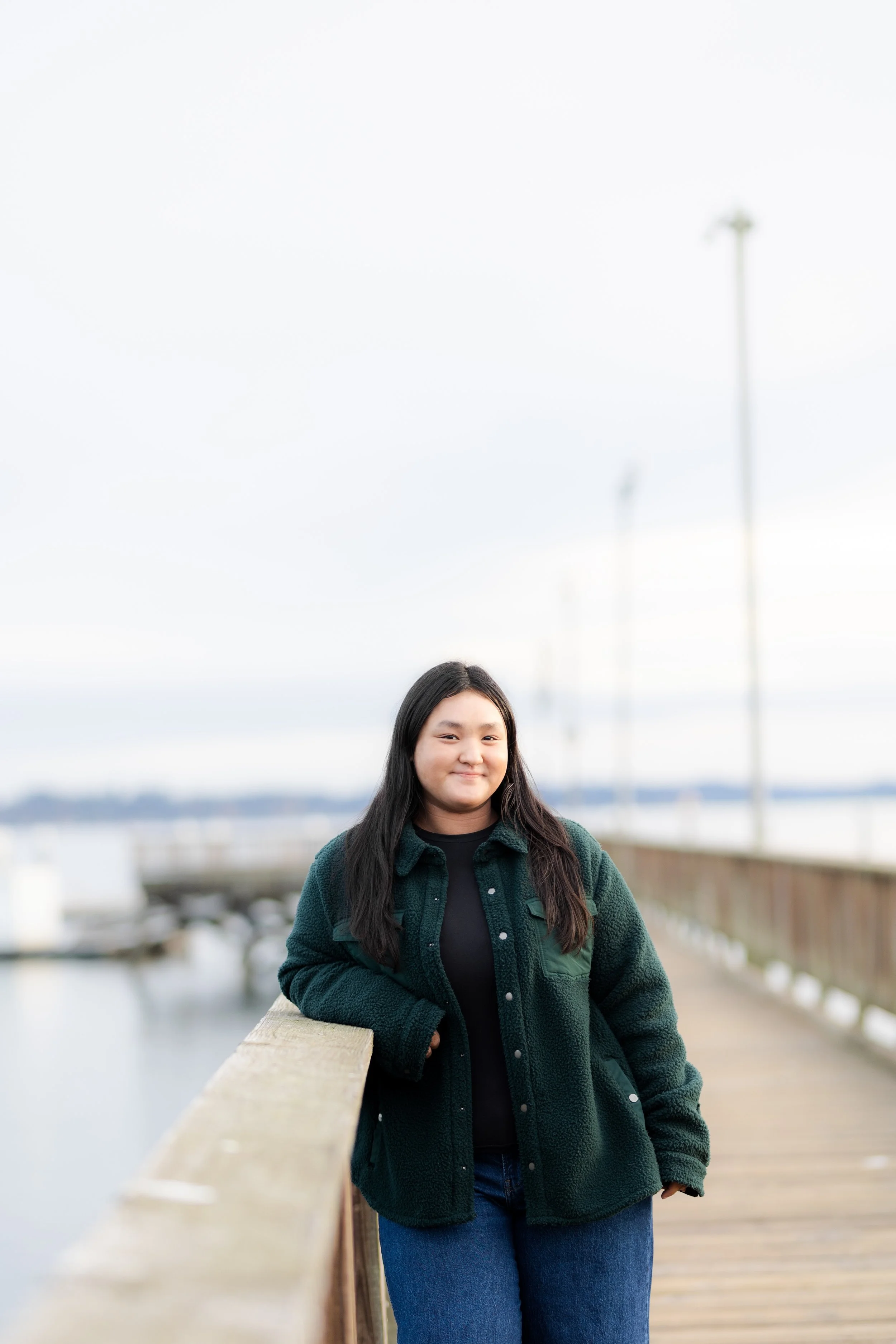 Kianna’s senior portrait session at the Silverdale Waterfront Park felt like a true Washington senior session. She wore dark tones featuring a dark, emerald-green cozy jacket that matched the cold-weather energy for her session.