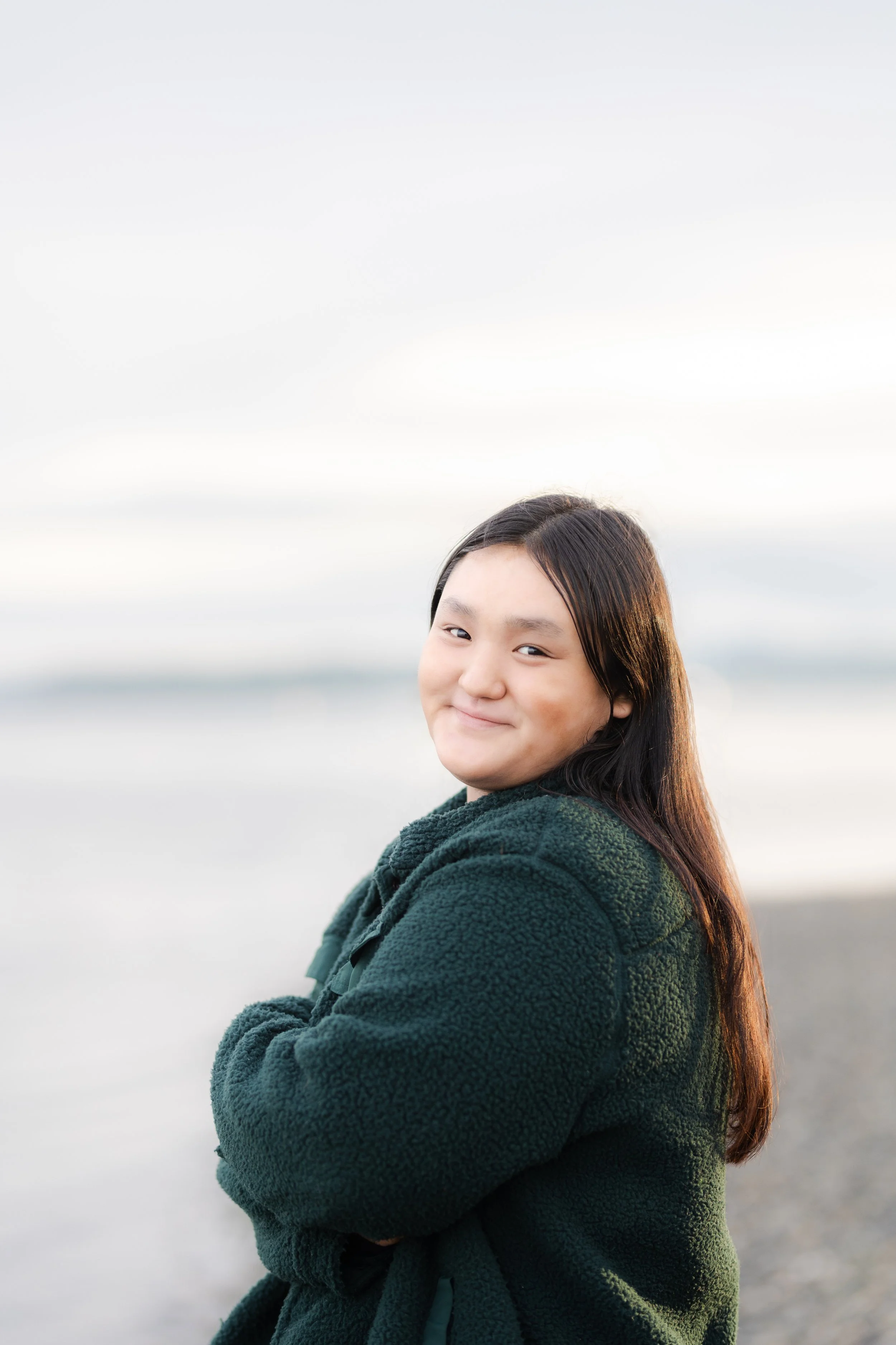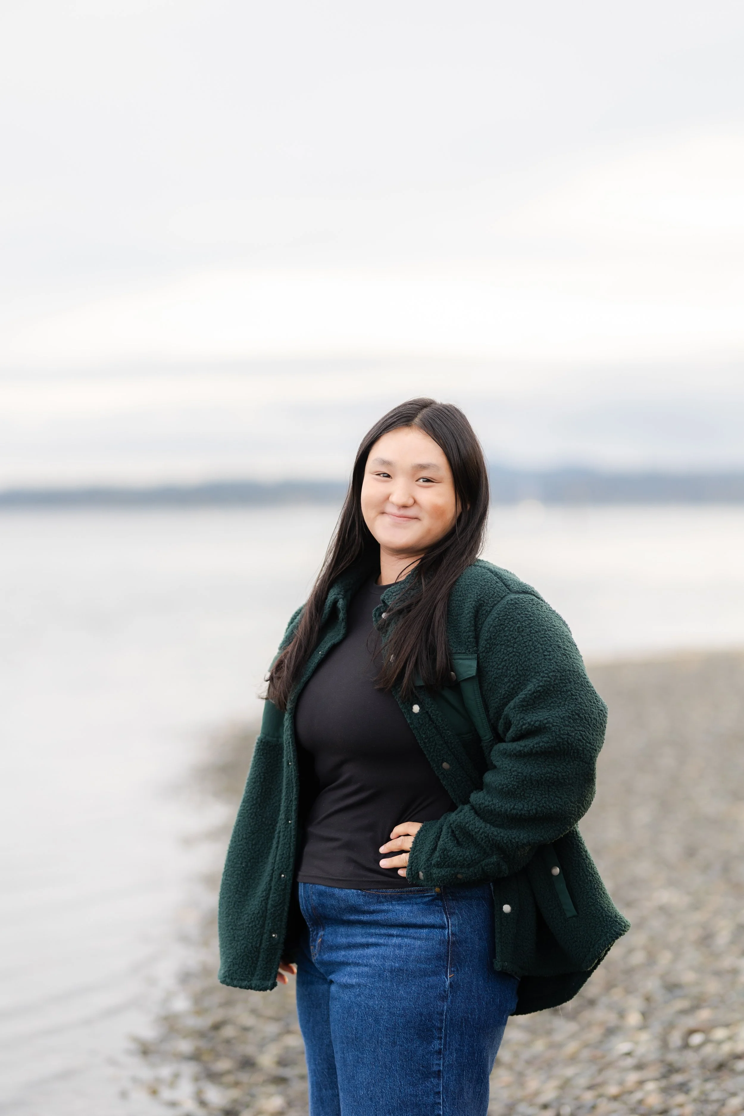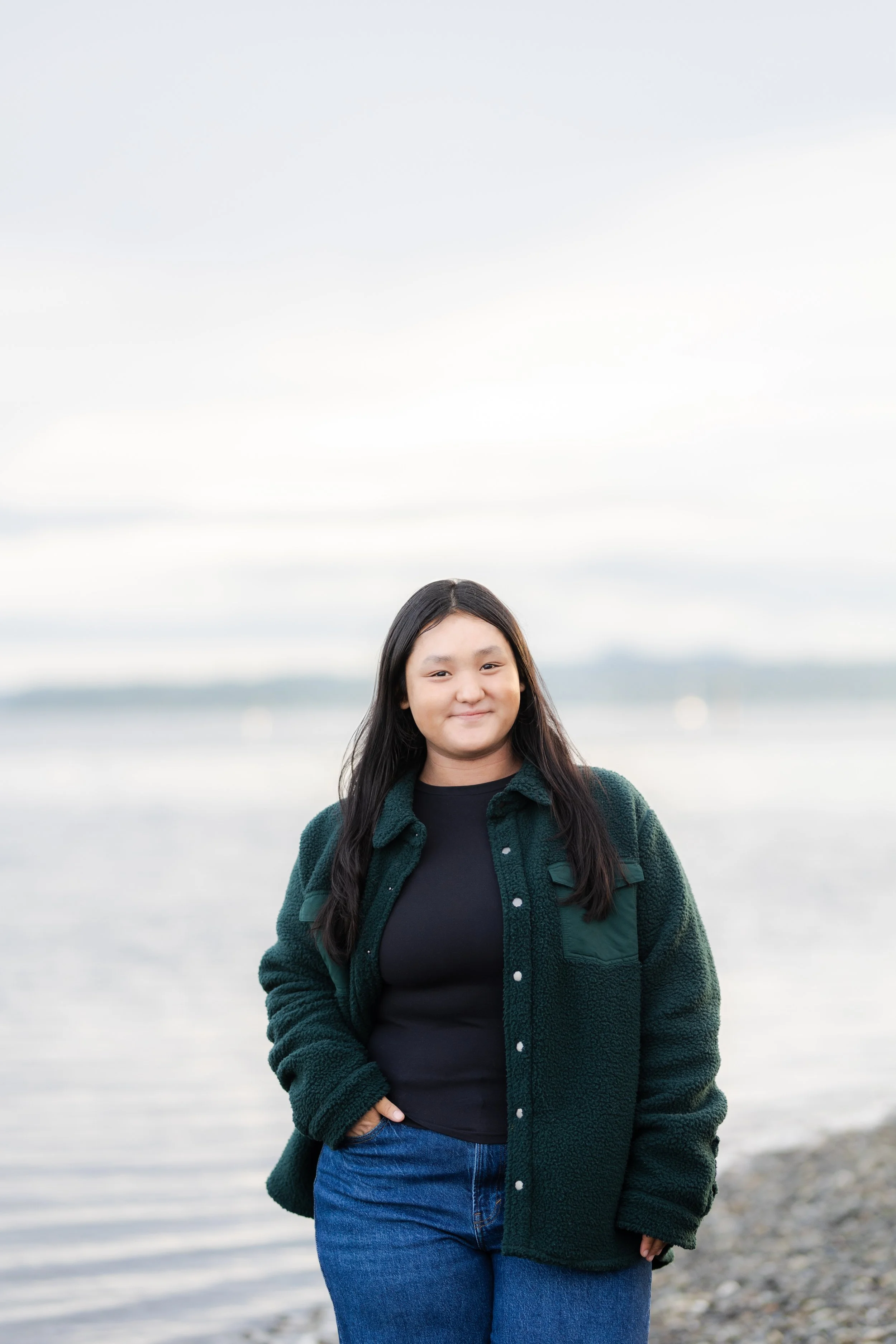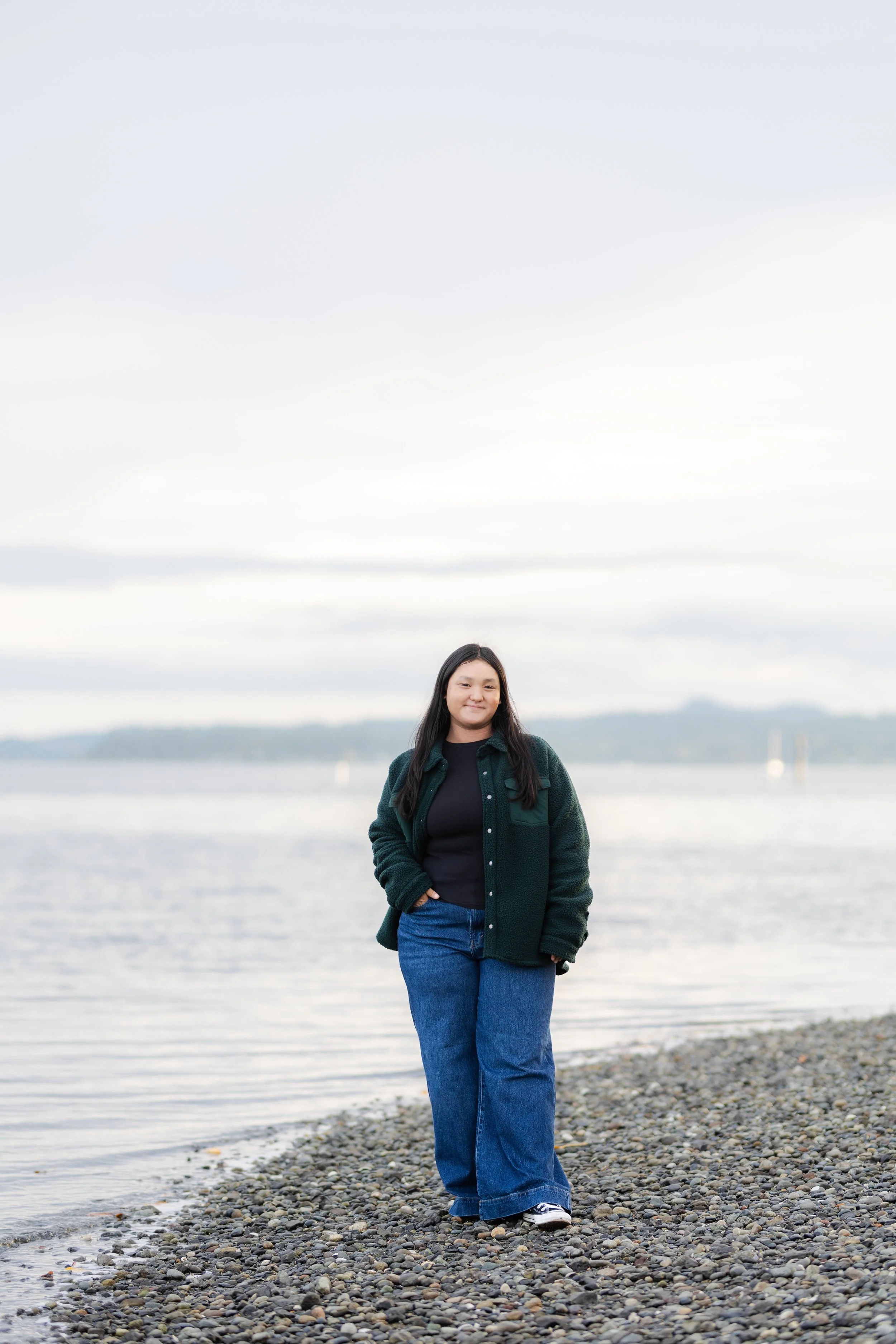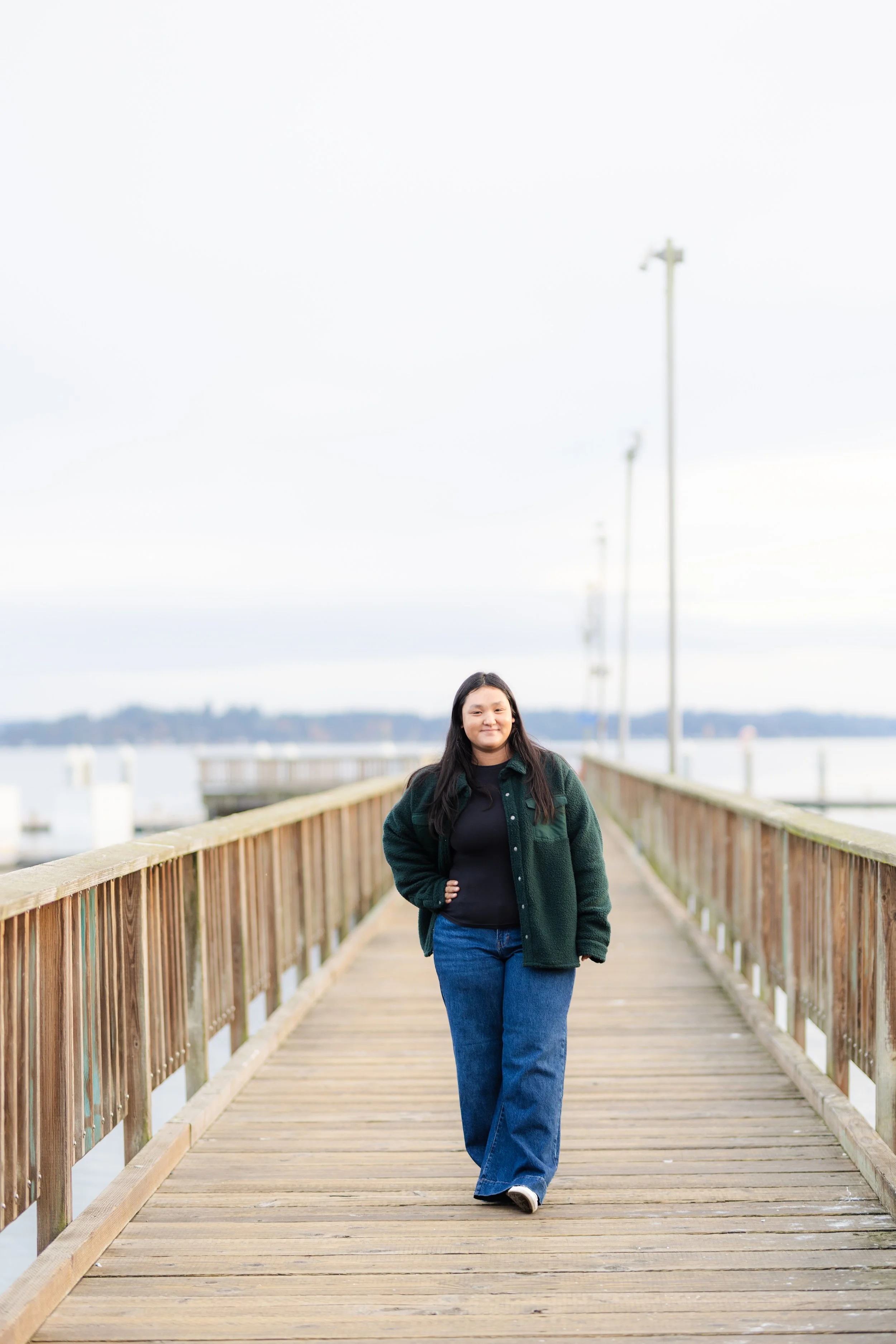 Kianna’s senior portrait session at the Silverdale Waterfront Park felt like a true Washington senior session. She wore dark tones featuring a dark, emerald-green cozy jacket that matched the cold-weather energy for her session.