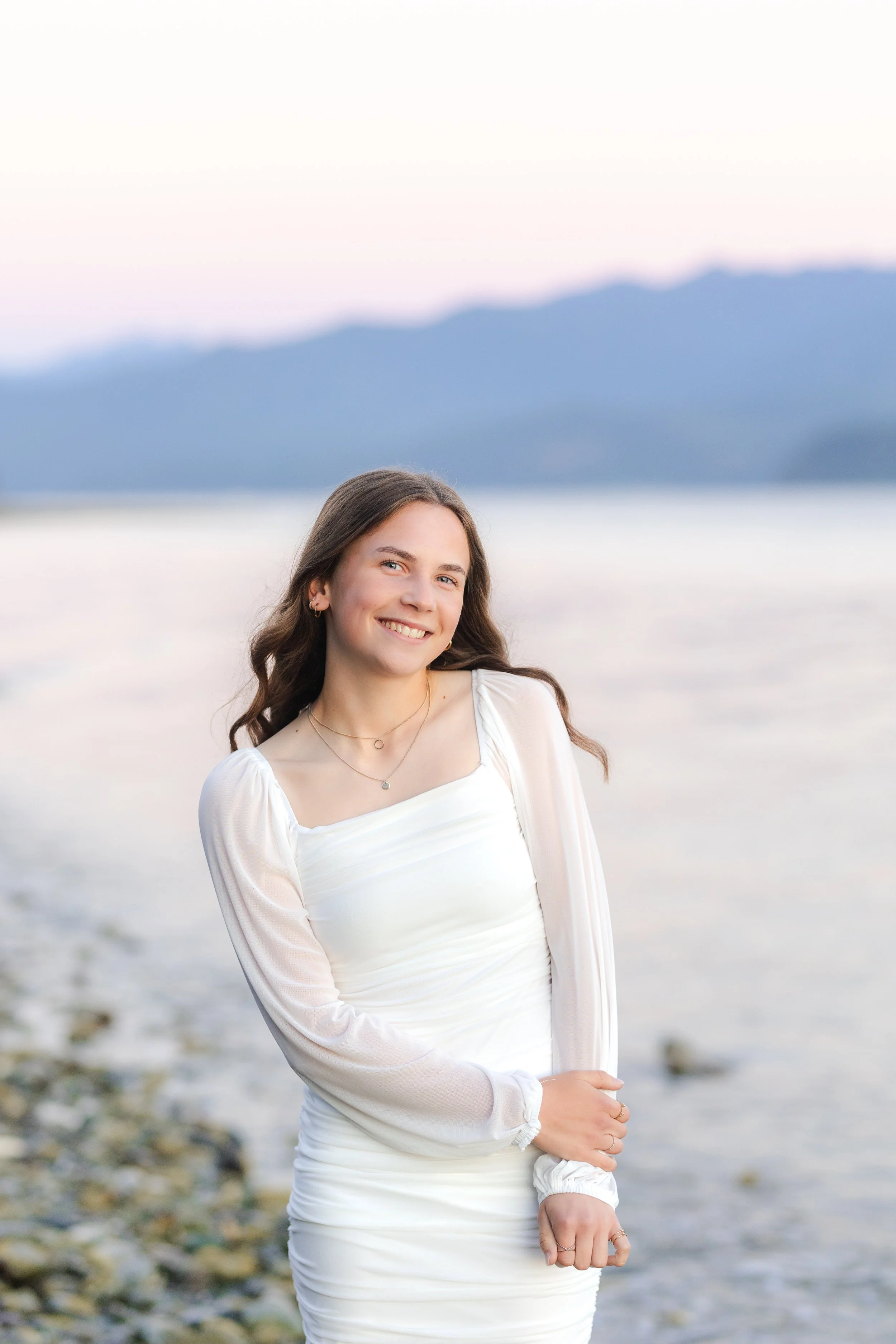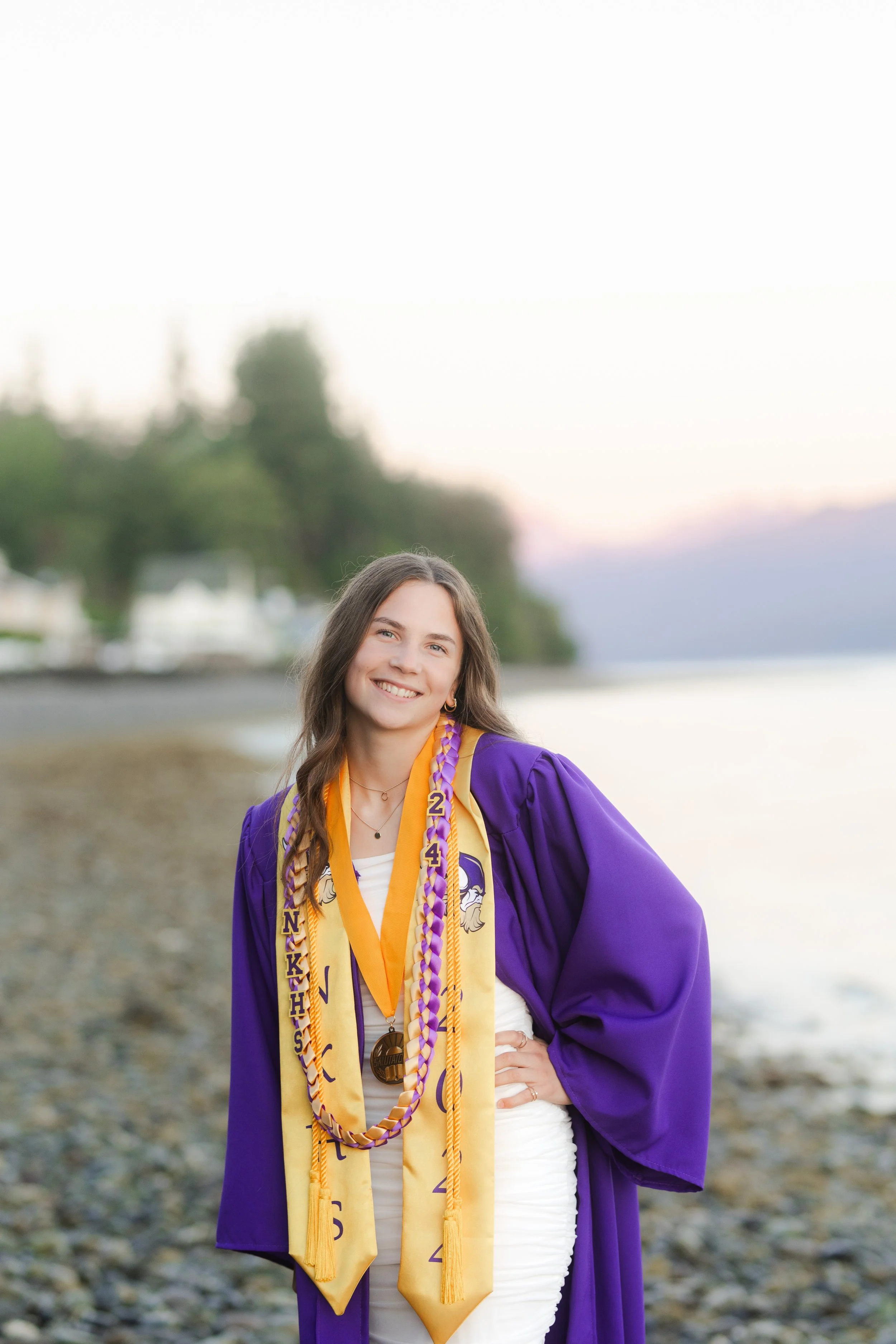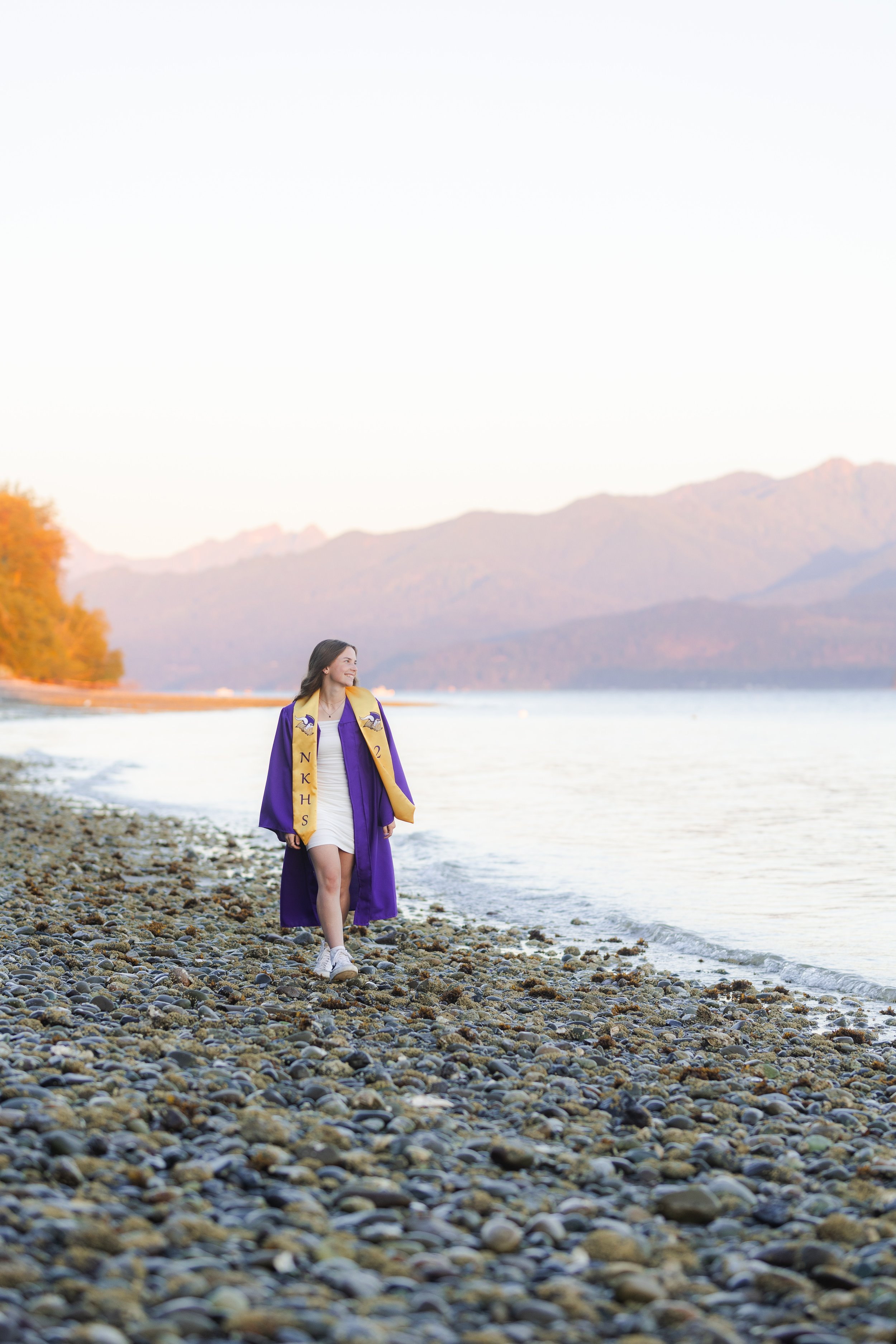 Allison’s senior session at the Seabeck Boat Launch boasted not only a beautiful view of the Hood Canal, but a stunning view of the Olympic Mountains, as well! She wore a beautiful white dress and her North Kitsap High School graduation regalia, both of which matched the purples in the sky, water, and mountains seamlessly.