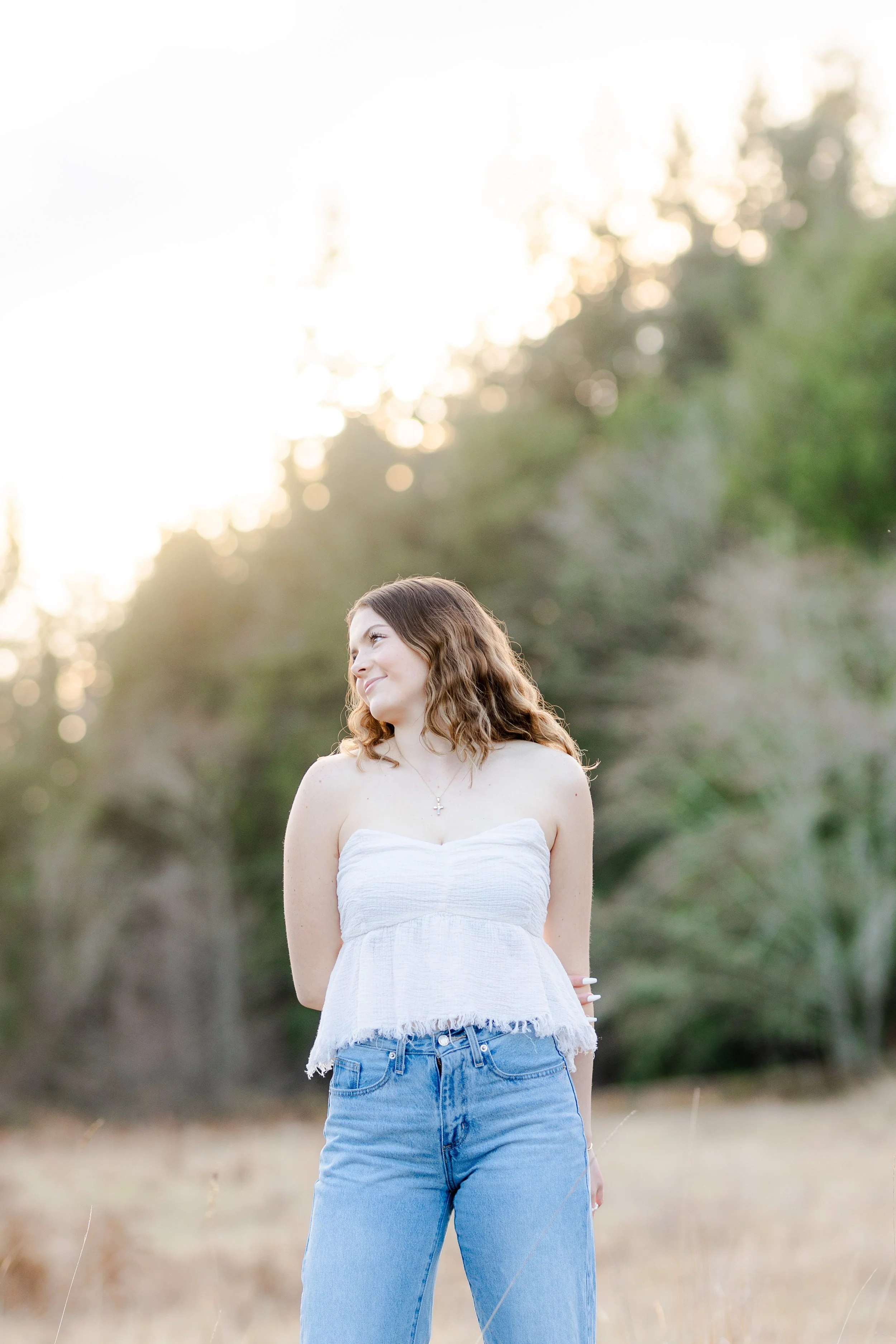 Ava’s fall senior portrait session at Howe Farm was soft and glowy. She brought two different tops to match with her blue jeans: a cozy sweater and a fun, strapless tank.