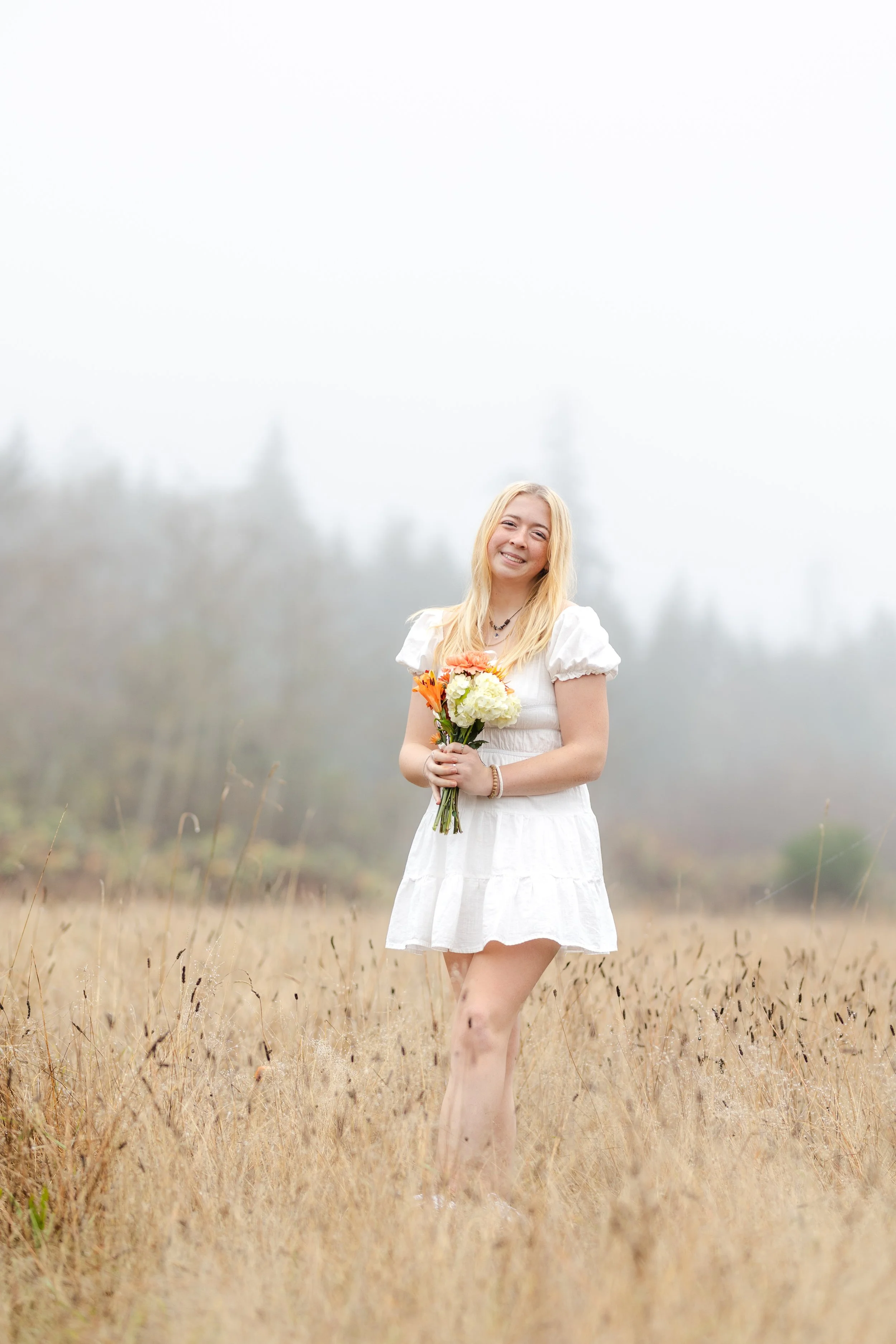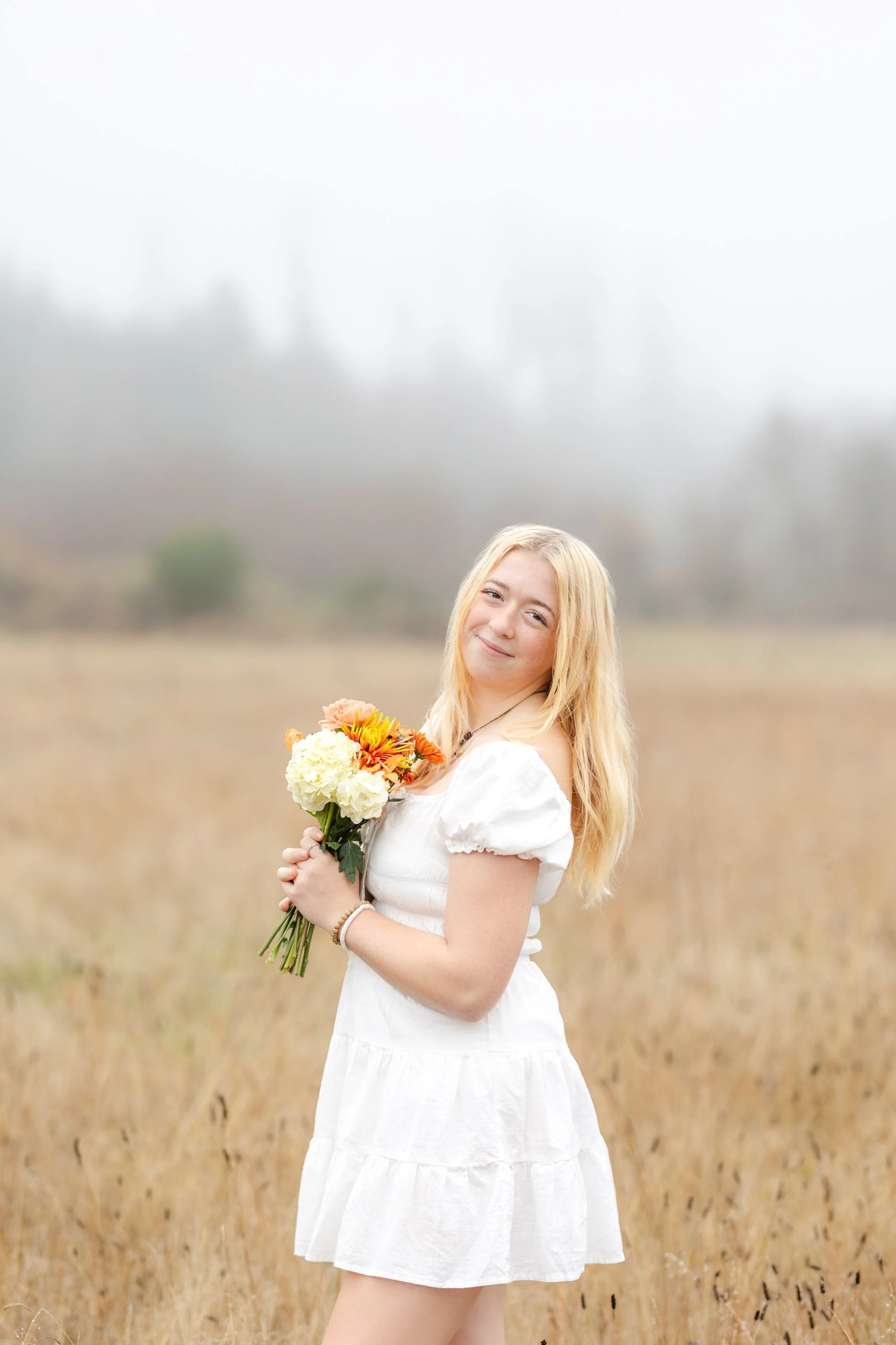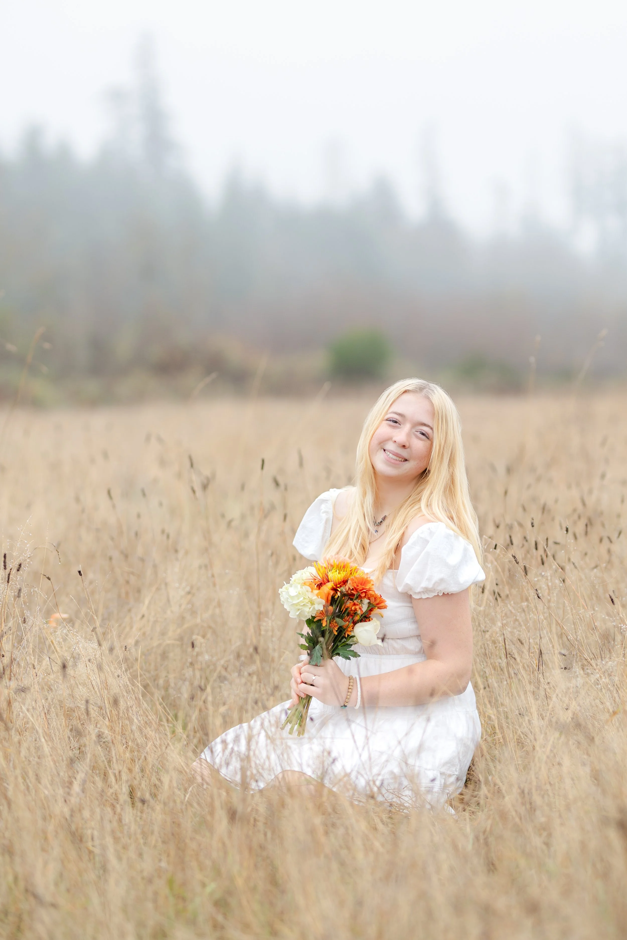 Sophie’s late-fall senior portraits at the Clear Creek Trails in Silverdale did not disappoint! She wore an adorable white dress and brought a cute bouquet to add a pop of color to her portraits.
