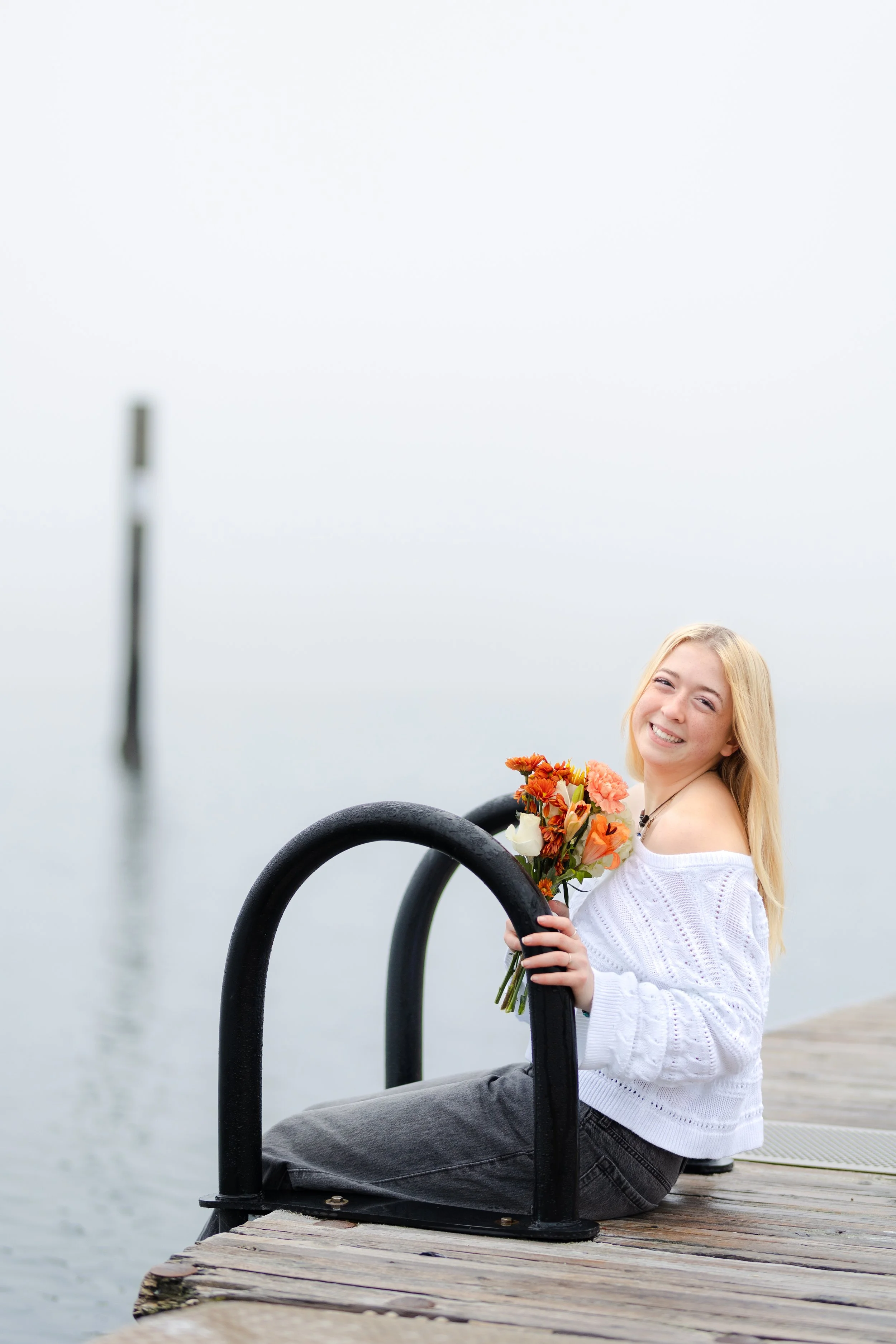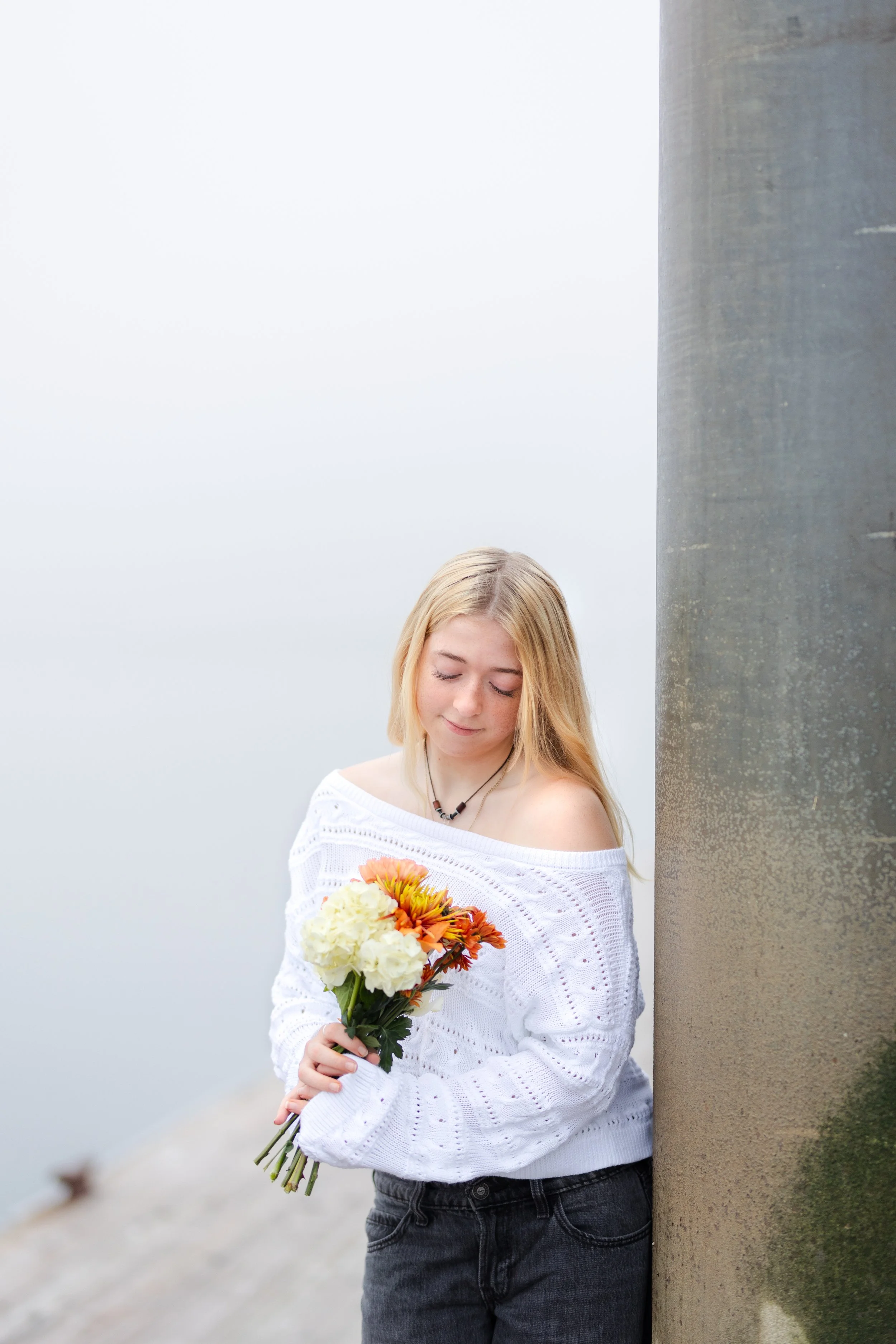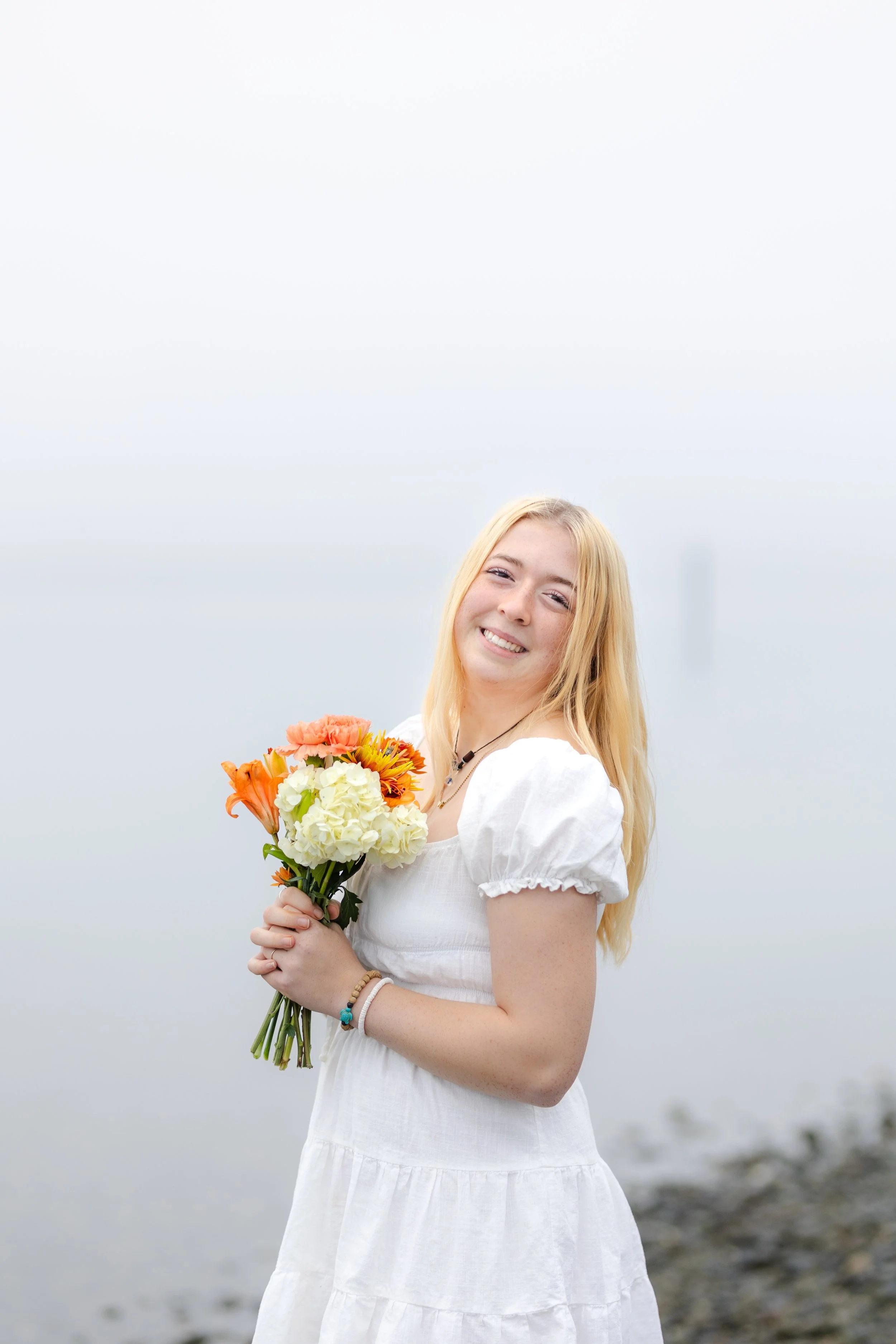 Sophie’s senior portraits session at the Silverdale Waterfront Park was filled with fog and created a beautiful backdrop for her senior pictures. Sophie brought along a gorgeous bouquet that helped her pop against the whites and greys behind her.