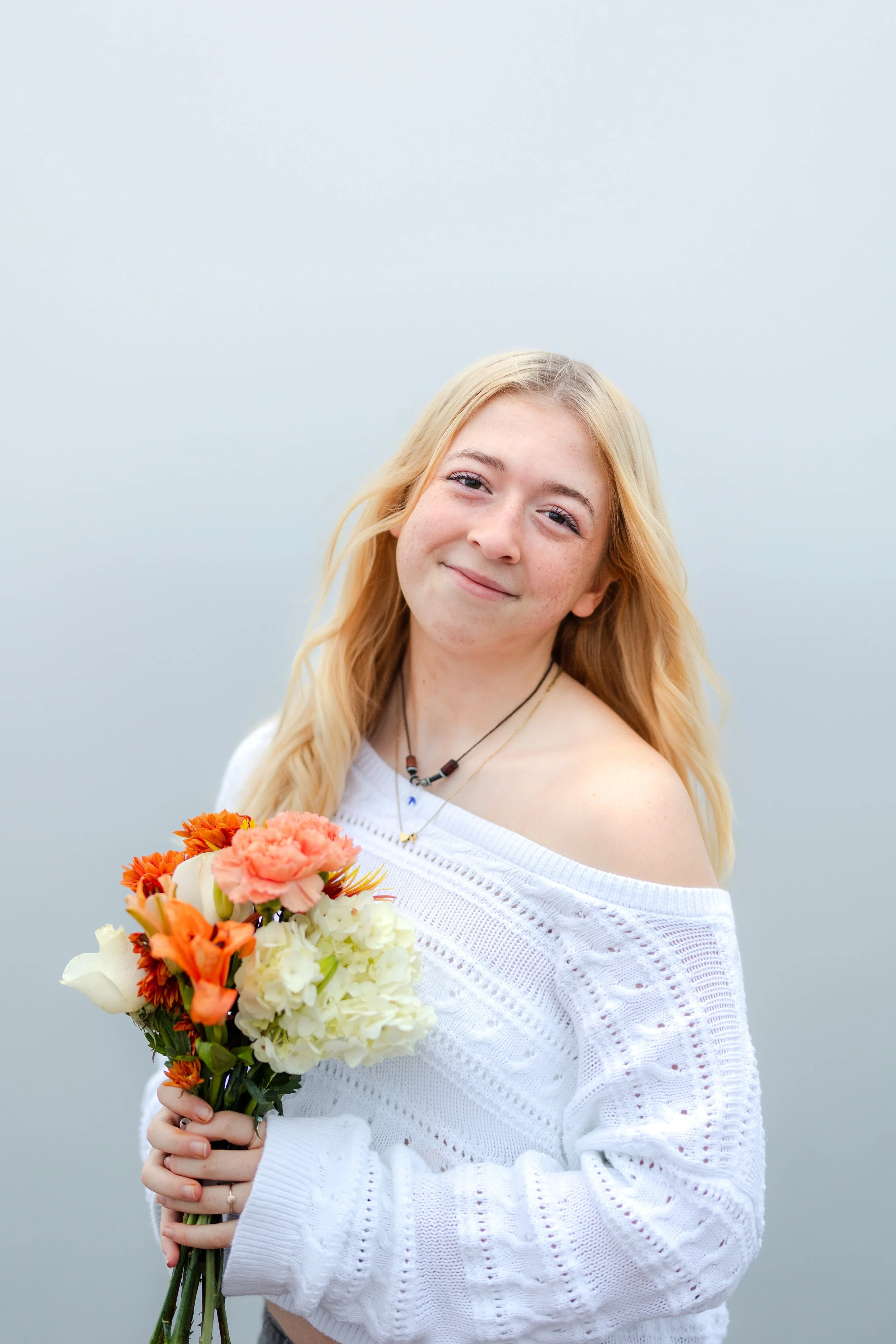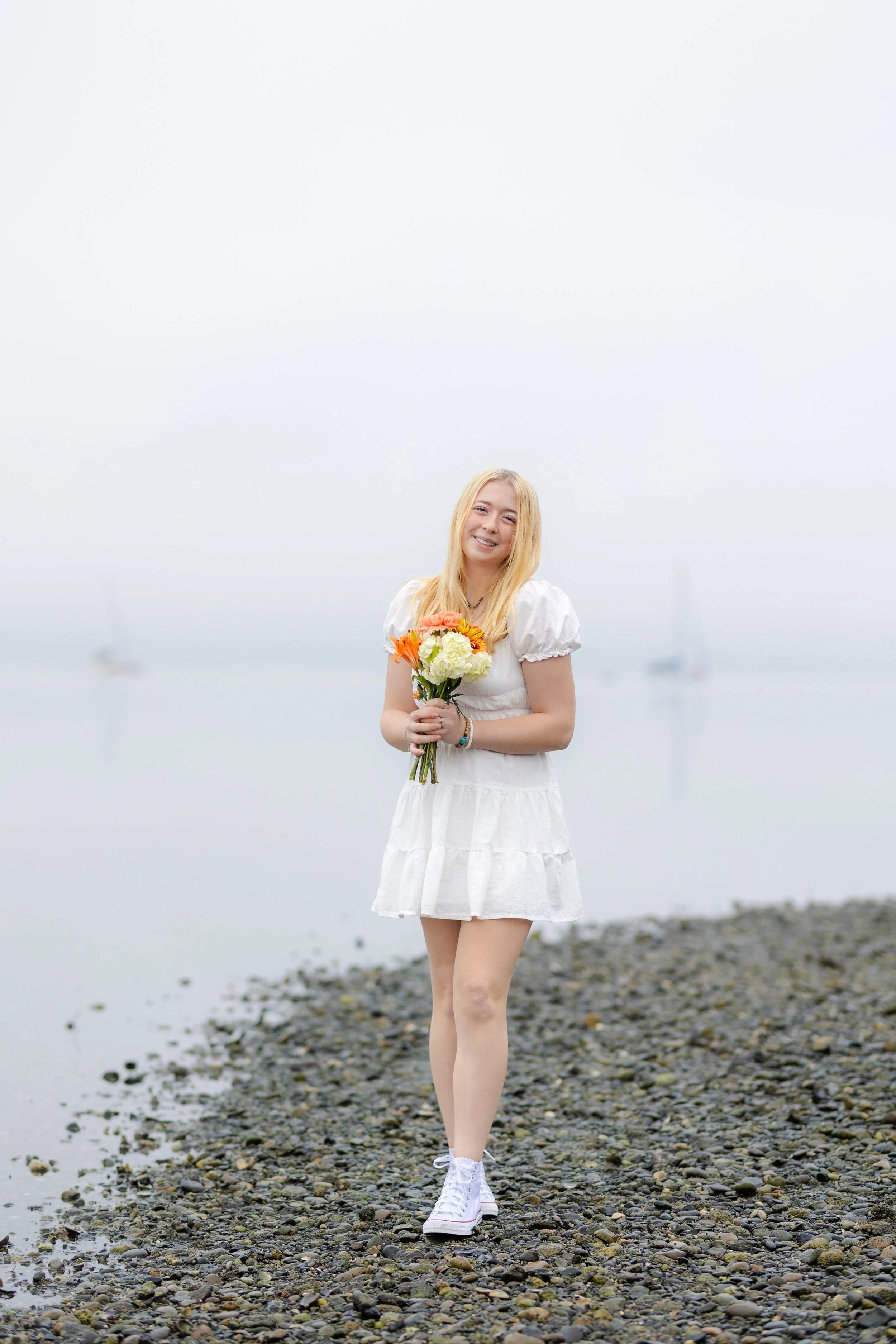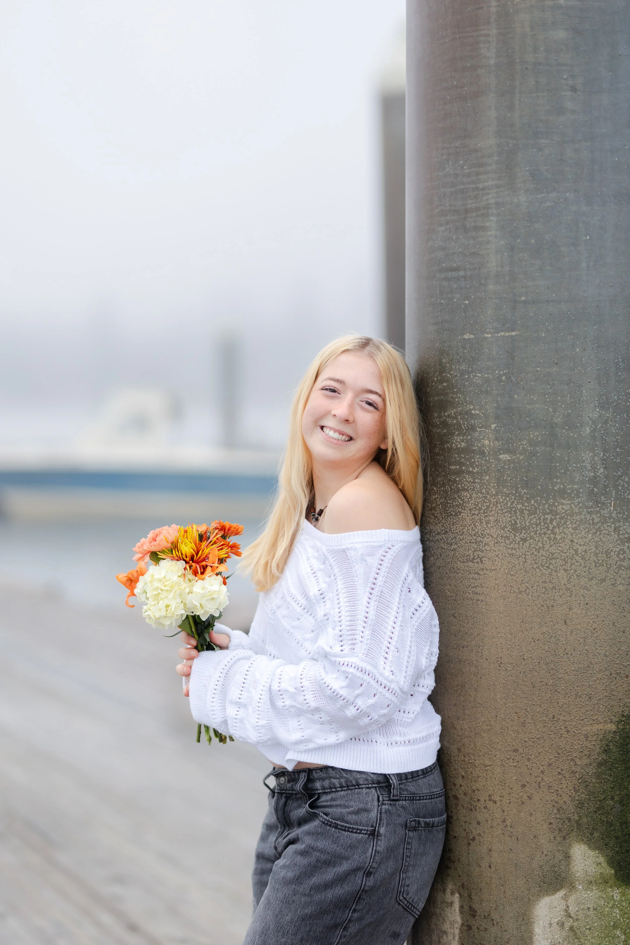 Sophie’s senior portraits session at the Silverdale Waterfront Park was filled with fog and created a beautiful backdrop for her senior pictures. Sophie brought along a gorgeous bouquet that helped her pop against the whites and greys behind her.
