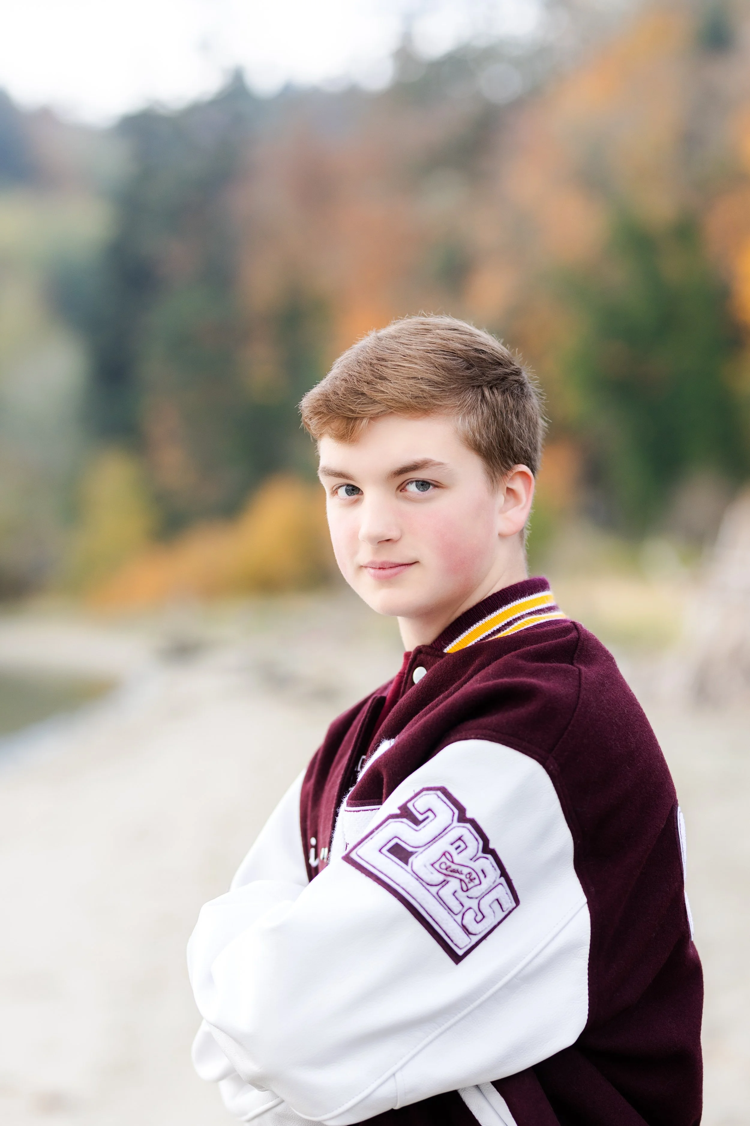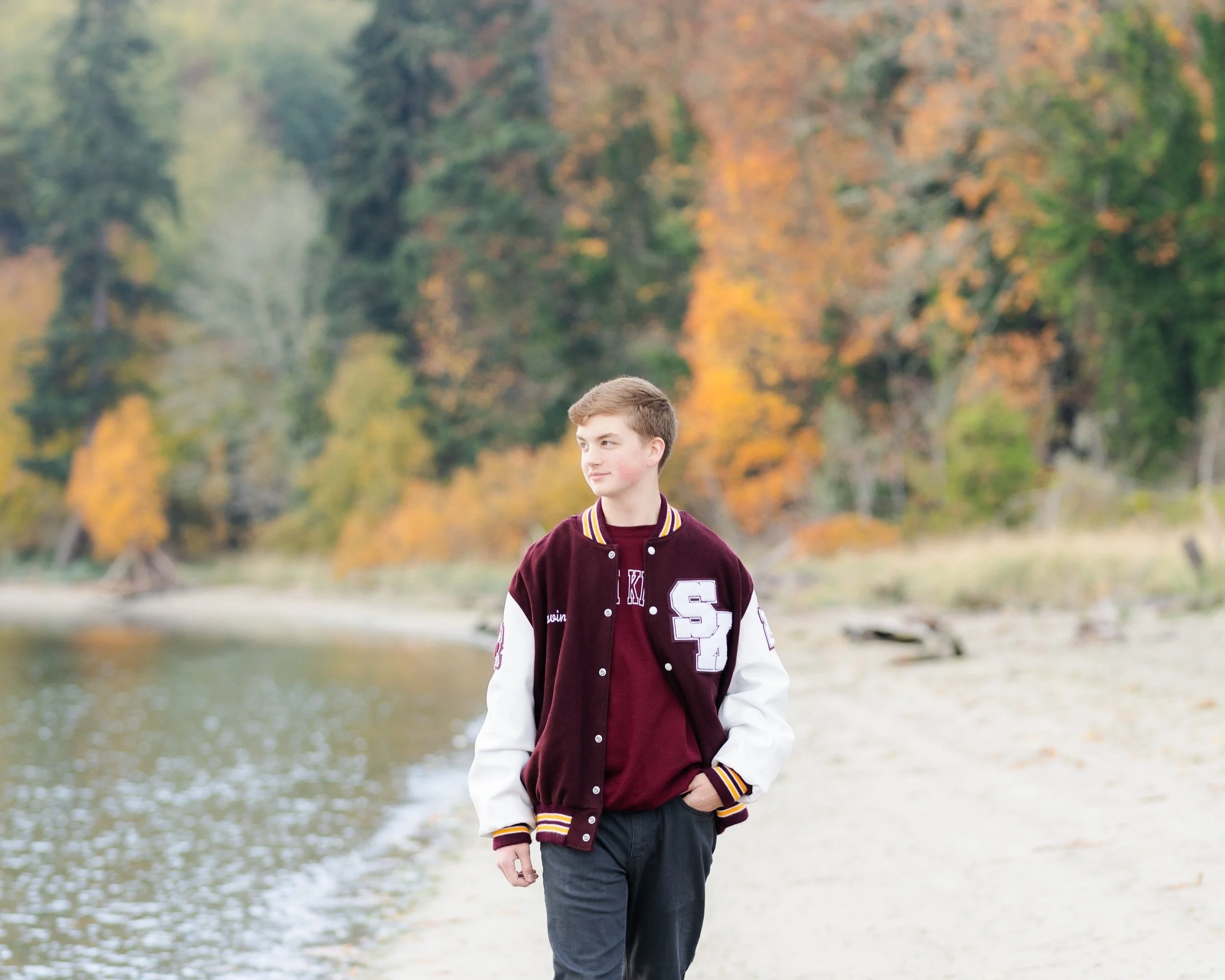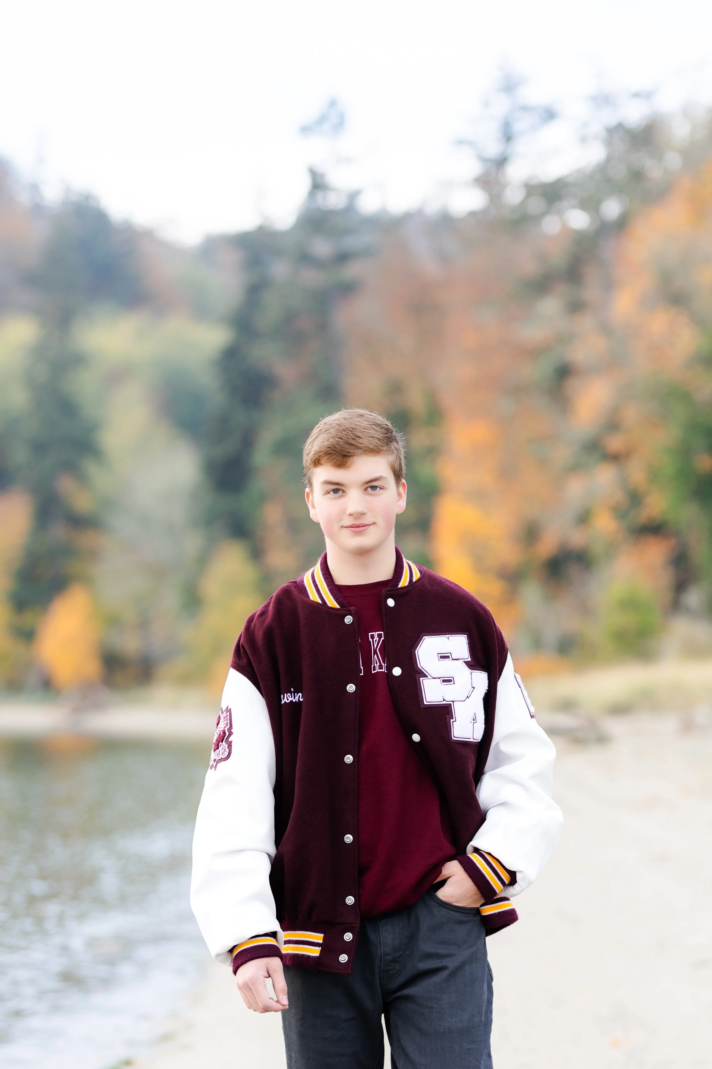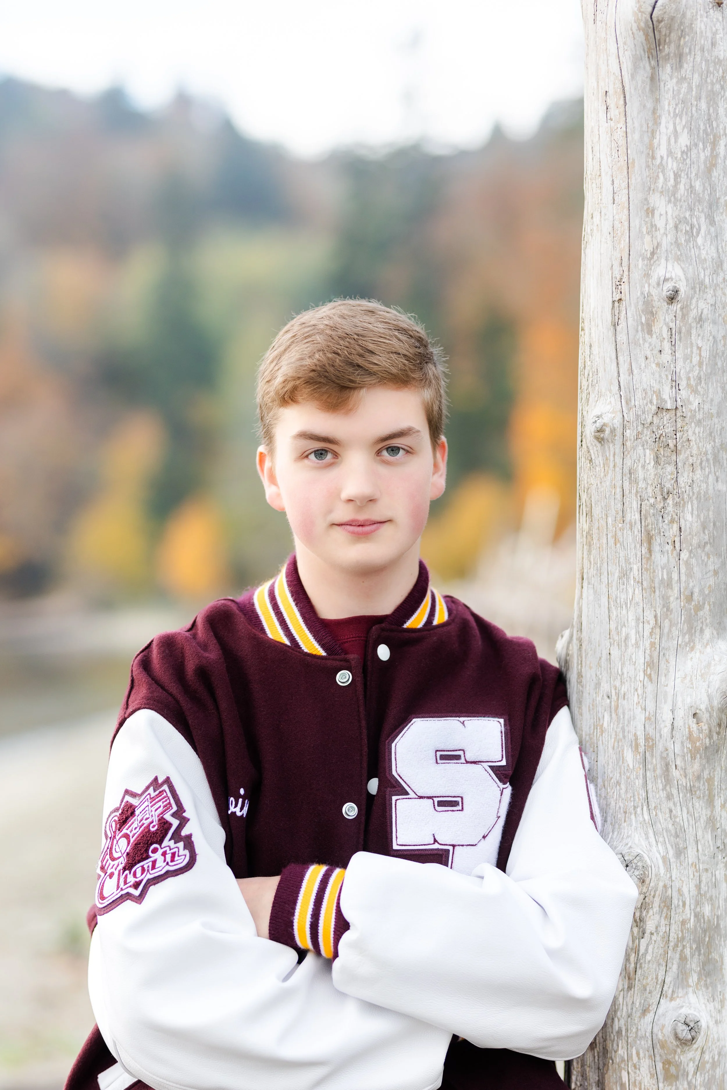 Tavin’s senior portrait session at Anderson Point Park in Ollala was out of a fall dream. He wore his South Kitsap High School maroon shirt, and alternated between having a maroon-and-white flannel and his maroon SKHS letterman jacket on top.